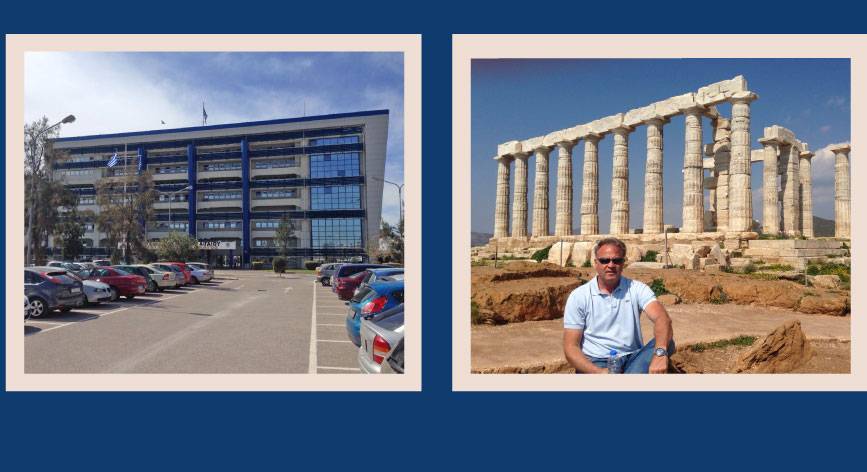 Links: Hoofdkantoor van de Hellenic Coast Guard. || Rechts: Tempel van Poseidon in Sounio.