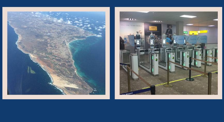 Links: Aruba vanuit de lucht.|| Rechts: 'Happy Flow', elektronische grenspassage.