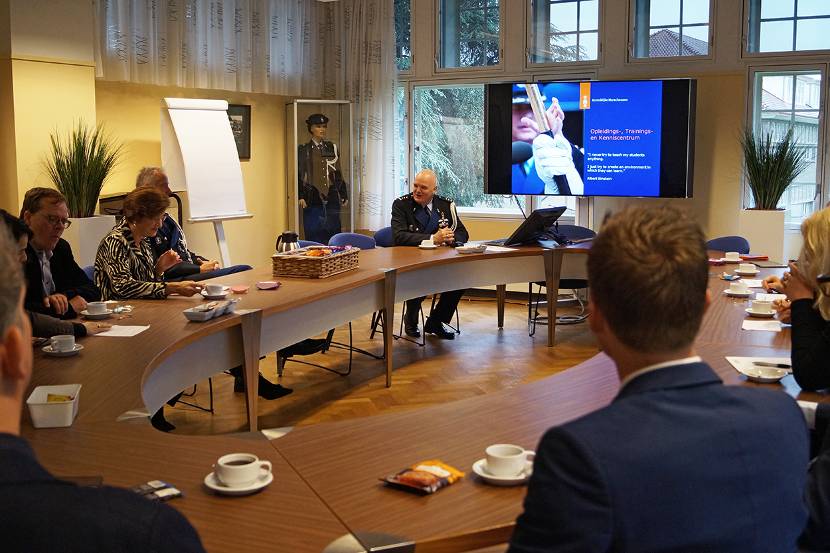 Commandant OTCKMar, kolonel Jan Roede, ging in gesprek met de groep over opleiding, training en kennisproductie. Specifiek werd ook ingegaan op vorming. Vanuit de commissie was er veel interesse voor integriteit, selectieprocedures en uitval. De leden kregen vervolgens voorlichting over KOWA (KMar Operationele Werkvloer activiteiten), de opleiding Hoog Risico Beveiliging (HRB), documentencontrole en border security. Tussendoor bezochten de leden de Klein Kaliber Wapens simulatie.