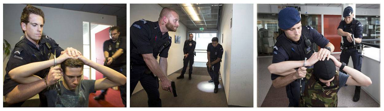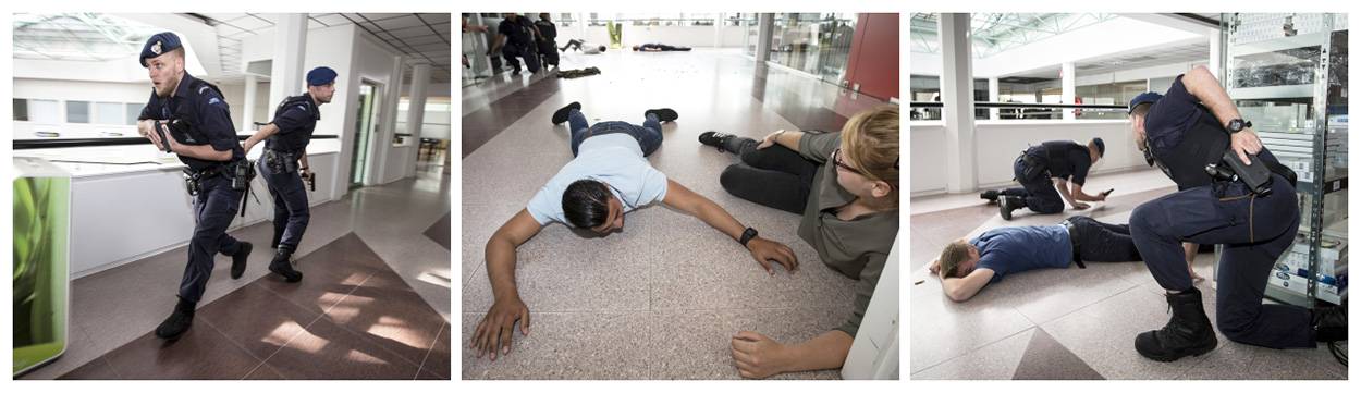 Het beoefenen van de protocollen gebeurt onder toezicht van trainer wachtmeester-1 Damian, van het Integrale Beroepsvaardigheden Team Zuid. Hij en zijn mannen zijn erop getraind collega's met kennis en kunde op het gebied van aanhouding en meer bij te staan. Vanwege het grote belang ervan zijn - in het als een carrousel ingedeelde oefenschema - ook de amok- en de pandenprocedure opgenomen. Plaats van handeling hiervoor is niet de terminal maar het European Business Centre op het bedrijventerrein, bij de brigade net om de hoek. Op de bovenste verdieping werd een passende setting opgebouwd. Alsof amokmakers daadwerkelijk een spoor van zinloze destructie achterlieten, zijn hier en daar 'dode' en 'gewonde' figuranten weggelegd. Kort na de oproep om bijstand, verschijnen wachtmeester-1 Teun en buddy ranggenoot Jos als eersten ten tonele.