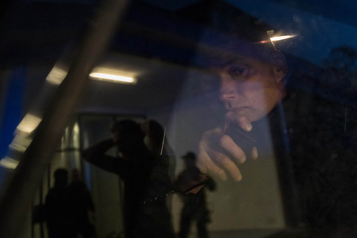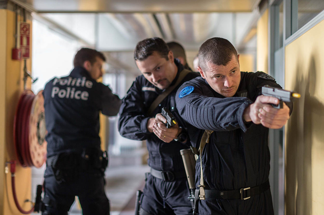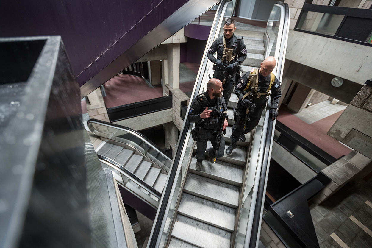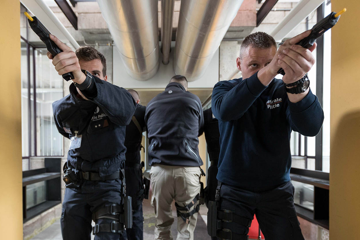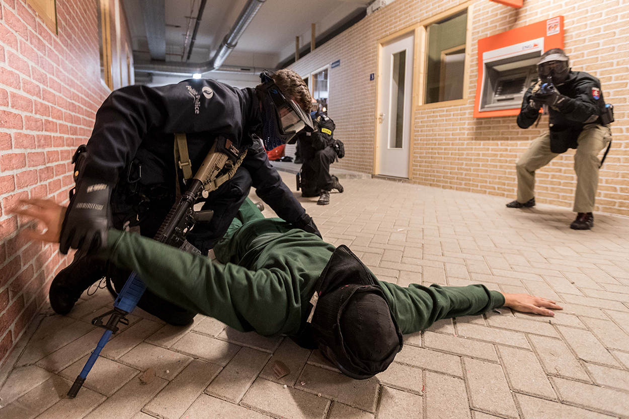 Belgische en Franse collega's oefenen in het verlaten Achmea-gebouw in Apeldoorn een pandenprocedure en zijn op zoek naar verdachten in het gebouw.