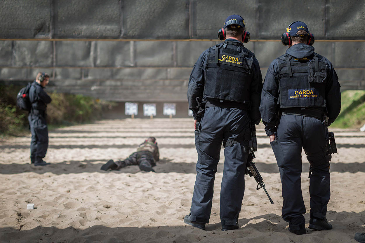 Een Poolse, Belgische en Slowaakse collega oefenen op de schietbaan 'vuur en beweging'. In totaal namen 10 landen deel aan de trainingsworkshop: België, Ierland, Polen, Portugal, Spanje, Slowakije, Italië, Frankrijk, Denemarken en Malta.