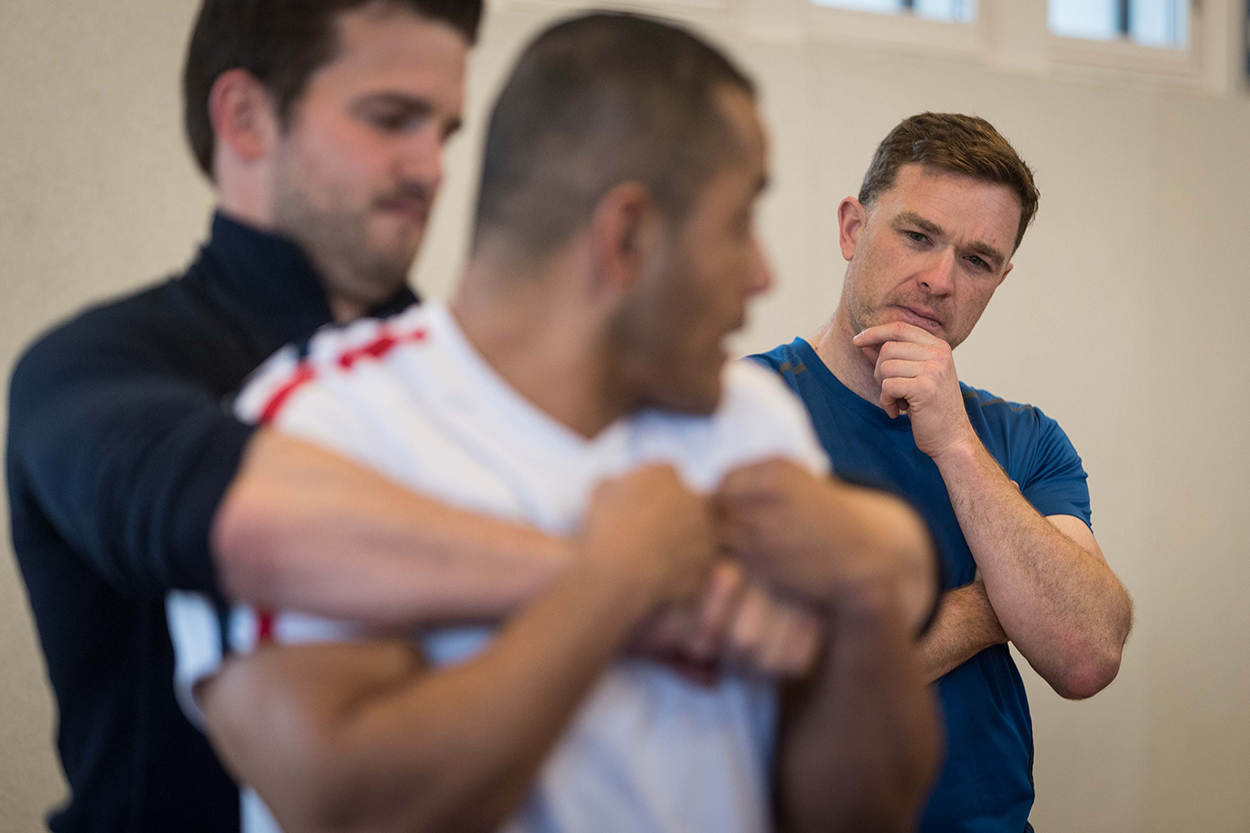 Close combat fighting: wat te doen op het moment dat je aangevallen wordt. Een Ierse collega kijkt aandachtig toe.