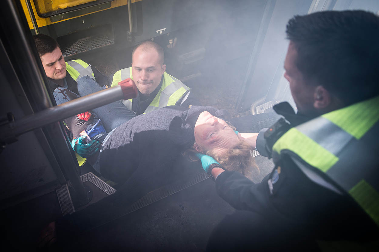 Een aanslag in een trein, een gijzeling voor de deur van een kinderdagverblijf en een groep raddraaiers die hulpverleners te lijf gaat. Brandhaarden, gewonden, slachtoffers en schermutselingen zorgen voor hectische situaties op het brandweeroefenterrein in het Drentse Wijster. En dat is precies de bedoeling. De brigade Politie en Beveiliging (P&B) en de brandweer en ambulancedienst van Schiphol oefenen namelijk in zes sessies van twee dagen het multidisciplinaire optreden en samenwerken in crisissituaties.