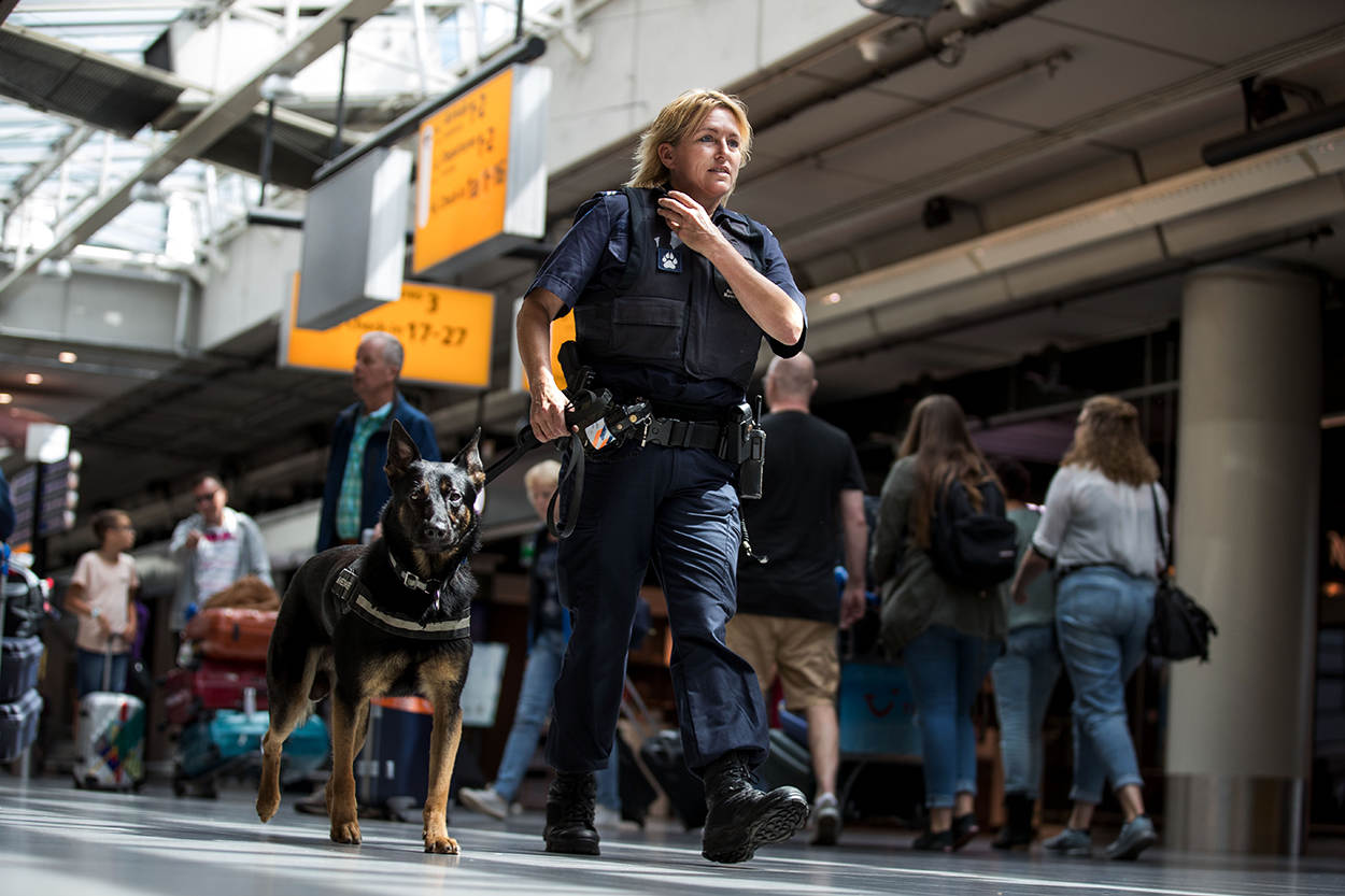 Je kunt over de hoofden lopen op Schiphol. Deze zomer zijn met 235.000 passagiers op één dag alle records gebroken. Dat betekent voor de KMar-medewerkers hard werken en alle hens aan dek, want hoewel reizigers het liefst snel doorlopen naar de taxfree shops, worden er geen concessies gedaan aan de veiligheid. Zij controleren paspoorten, patrouilleren in en rond de luchthaven en houden alle camerabeelden scherp in de gaten. Ook de speurhonden zetten hun beste pootje voor op zoek naar mogelijke explosieven.