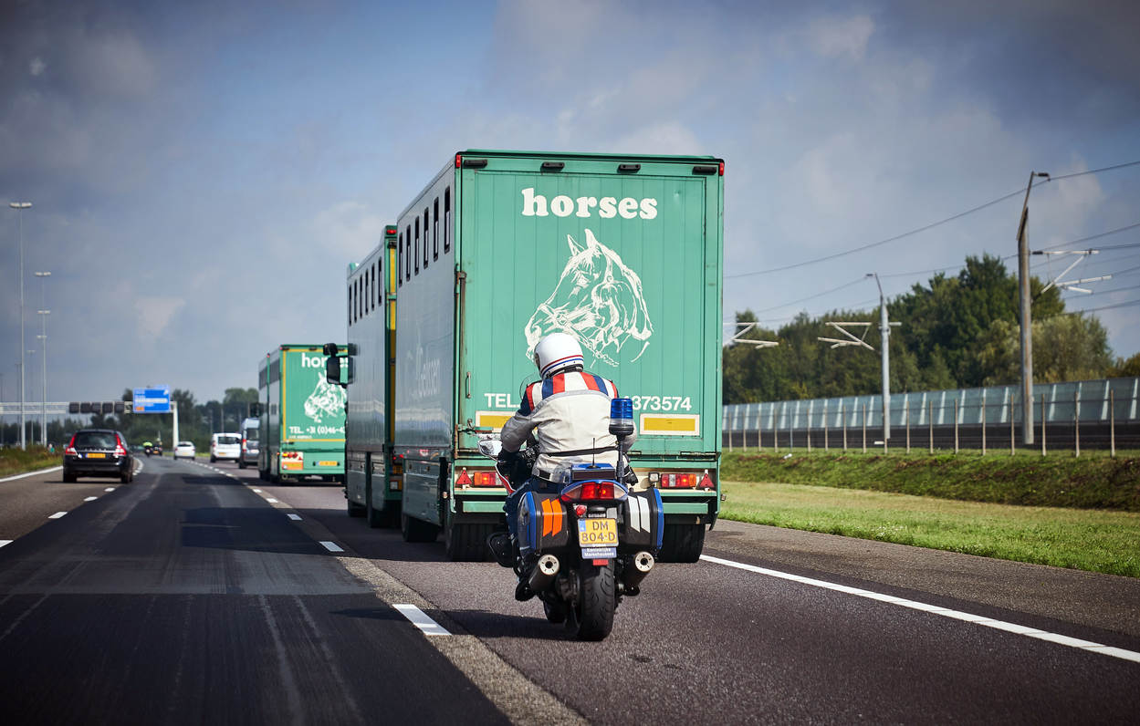 Een deel van de paarden voor Prinsjesdag komt uit België. Op de vrijdag voor Prinsjesdag escorteren de motorrijders de Belgische politiepaarden van grensovergang Hazeldonk naar renbaan Duindigt in Wassenaar. De paarden worden vervoerd in twee vrachtwagens met aanhanger, een flinke combinatie op de snelweg die ook nog eens langzaam rijdt. Bij de grens bespreken de motorrijders de route en begeleiden het geheel vervolgens noordwaarts. “Wij zorgen ervoor dat er geen ander verkeer tussen de vrachtwagens komt om gevaarlijke situaties te vermijden”, verduidelijkt wachtmeester-1 Edu. “Ook zeten wij kruisingen af, zodat de vrachtwagens ongestoord kunnen oversteken.” Het zonnetje schijnt, het waait niet te hard en het is redelijk rustig onderweg. Edu was dan ook kort over de rit: “Geen bijzonderheden.”