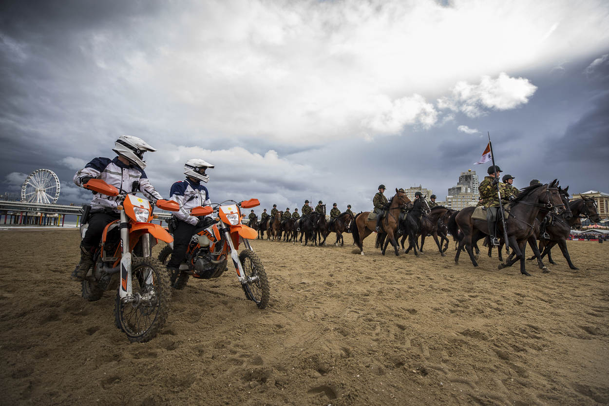Op de laatste dag voor Prinsjesdag oefenen de bereden eenheden op het Scheveningse strand met rookgranaten en oefenmunitie. Twee KMar-motorcrossers escorteren hen van de strandopgang naar de oefenplek. Normaal gesproken bestrijdt motorcrosser wachtmeester-1 Rik vooral illegale crosserij op de Leusderheide en begeleidt hij voertuigen over de snelweg. Heel wat anders dan vandaag. “De sfeer hier is ontspannen; mensen zijn niet gehaast en luisteren goed naar je. Ook stellen ze allerlei VVV-achtige vragen over de oefening.” Even verderop wordt de hulp ingeroepen van een KMar-motorrijder voor een onverwachte klus. Wachtmeester-1 Pim komt uit Den Haag aangesneld om een haperend verkenningsvoertuig van de landmacht te escorteren. “Gelukkig zitten we vlakbij, dus we zijn zo ter plaatse.”