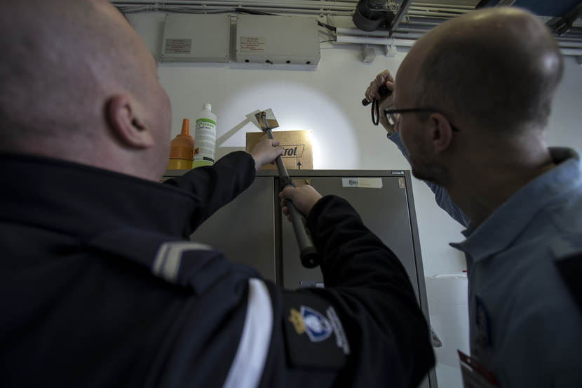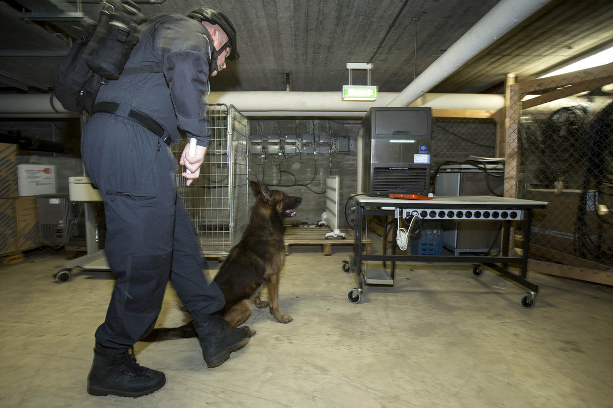 Er is vermoedelijk een explosief verstopt in een van de gebouwen op het NAVO-terrein. De teamleider CBRN-E van de Marechaussee stelt het plan op voor de zoeking. De Officier van Dienst-Politie (OvD-P) van de KMar handelt conform het Protocol Verdachte Objecten en verzorgt ook de verbinding tussen de OvD van het NAVO-complex en andere hulpverlenende instanties. Dat kan bij een vondst ook de Explosieven Opruimingsdienst zijn. Hollandse herder Fonkel en 'baasje' Lex zijn snel ter plaatse. "De explosievenhonden zijn een hulpmiddel", benadrukken de begeleiders. "Meestal willen ze meteen aan de slag, maar soms zijn het net mensen", zegt opper Lex. De hulpmiddelen worden uit de koffers gehaald. De explosievenverkenners van de KMar doen regelmatig preventieve zoekingen, zoals op 4 mei op de Dam. "We werken daarin veel samen met de politie, die een soortgelijke eenheid als de onze heeft", weet instructeur adjudant Edwin Branse. Buiten controleert een explosievenverkenner de voertuigen op het terrein. Mogelijk zijn ook hier explosieven verstopt. "Evacueren, nieuwsgierigen op afstand houden. En vooral nauwkeurig alle stappen bijhouden, zodat iedereen in dit vak ervan kan leren." Ook de garage ondergaat een grondige inspectie. De 'explosieven' zijn op de gekste plaatsen verstopt, zoals in een ijsmachine. Dan komen de explosievenhonden heel goed van pas. Binnen de kortste keren pakken ze de geur op en gaan erop af. In alle gaten en kieren zoeken de explosievenverkenners naar verdachte objecten. Met spiegels en infrarood-apparatuur is veel te vinden. In de kelder gaat 'explosievensnuffelaar' Boris zitten. Het betekent dat hij iets heeft gevonden. Opperwachtmeester Bas gaat verder op onderzoek uit. Er zit iets in de machine verstopt. "Zoek!" Hondenfluisteraar Martin Gaus zou Fonkel wel wat manieren willen bijleren, maar dat is juist niet de bedoeling. "Ze moeten gretig zijn en in dit spel ook daadwerkelijk iets vinden. Anders gaat de lol er snel vanaf voor de honden." Fonkel heeft z'n best gedaan en krijgt een beloning van opper Lex. Het werk voor explosievenhond Fonkel en opper Lex zit erop. Op de plaats rust: de evaluatie van de zoektocht is gaande. Herder Boris kijkt verwachtingsvol naar zijn begeleider. De hond wil nog wel een keer spelen in de kelder, op zoek naar mogelijke explosieven.