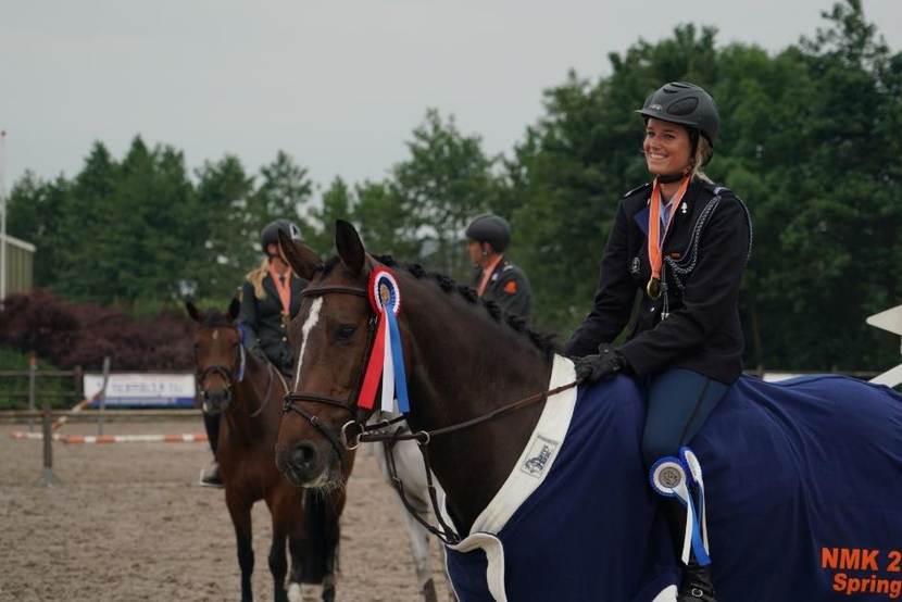 Opperwachtmeester Stephanie Gog mag zich een jaar lang Nationaal Militair Kampioen Springen noemen. Tijdens het NMK Dressuur en Springen op vrijdag 8 juni in Bunschoten was zij de sterkste in de zwaarste klasse.