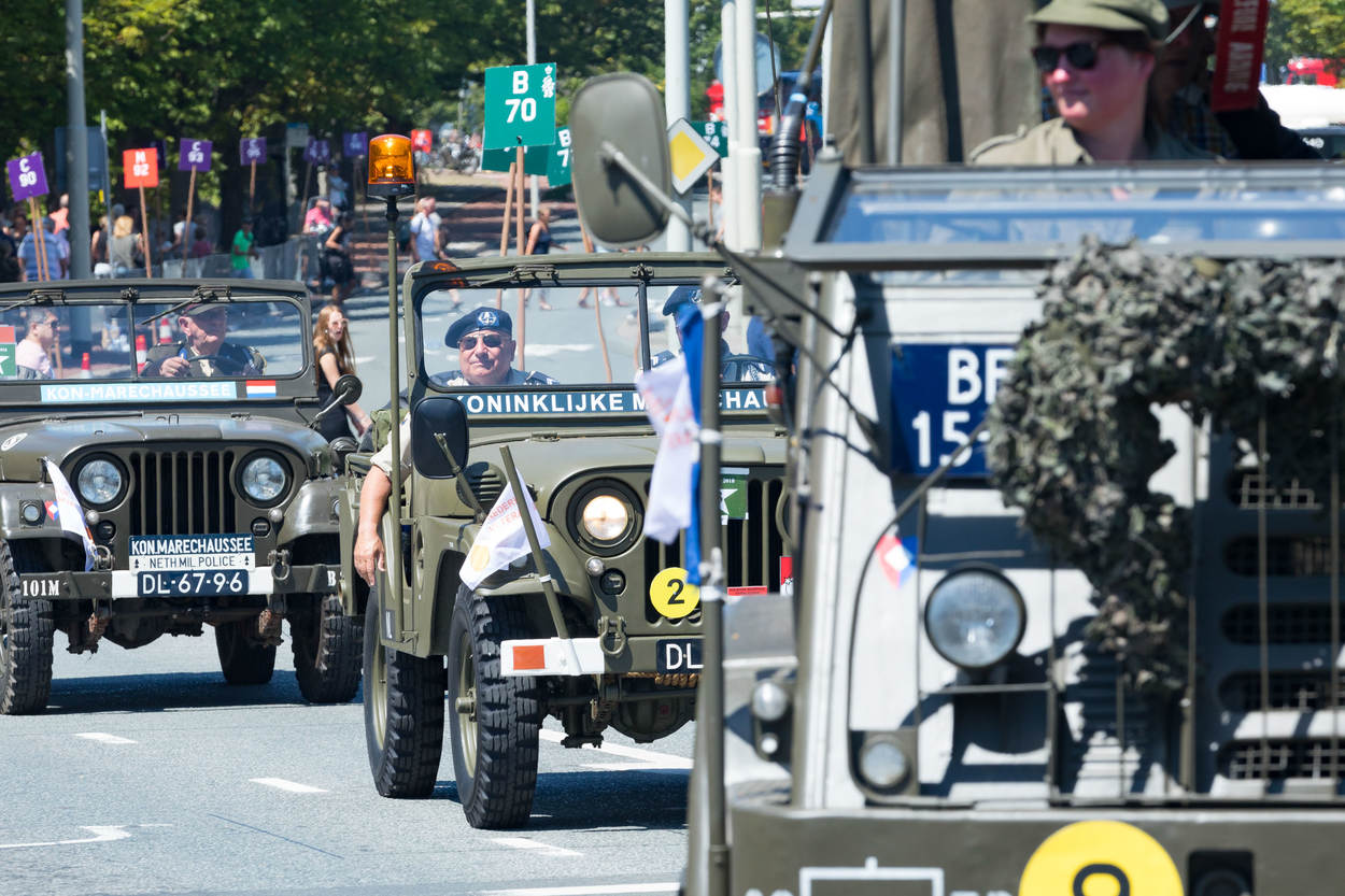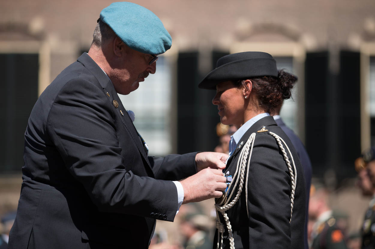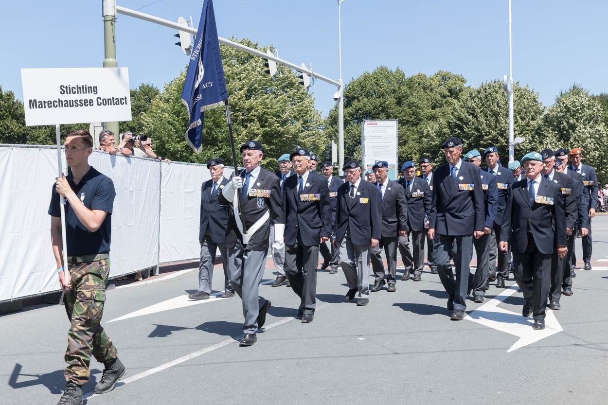Op het Binnenhof krijgt luitenant-kolonel Daisy Costongs de herinneringsmedaille opgespeld voor haar bijdrage als genderadviseur aan de NAVO-missie Resolute Support in Afghanistan. Even na 13.00 uur begon het kleurrijke defilé door de Haagse binnenstad. Namens de KMar liepen het Opleidings-, Trainings- en Kenniscentrum Koninklijke Marechaussee (OTCKMar), het Landelijk Tactisch Commando (LTC), Staf CKMar en het Trompetterkorps mee in het defilé. De Nederlandse Veteranendag is een eerbetoon aan ruim 115.000 militairen. Circa 90.000 bezoekers applaudisseerden en zwaaiden het défilé enthousiast toe langs de route. Aangekomen bij de koning zong het Trompetterkorps der Koninklijke Marechaussee uit volle borst het Wapenlied. Bijna 4.000 veteranen en militairen marcheren rond de Hofvijver, gevolgd door historische en moderne voertuigen. Bezoekers konden onder meer een YPR van de Bijstandseenheid West bewonderen en een Amarok van het Landelijk Tactisch Commando. Veteranen zijn er in vele ‘soorten en maten’. Van oudgedienden uit de Tweede Wereldoorlog tot actief dienende marechaussees die op missie gingen naar bijvoorbeeld Afghanistan of Mali. Ook de Stichting Marechaussee Contact (SMC) gaf acte de présence. De stichting is toegankelijk voor iedereen die op de hoogte wil blijven van het reilen en zeilen bij de Koninklijke Marechaussee. ME’ertje spelen? Gaaf! Fanatiek stonden kinderen in ME-tenue op linie. In het activiteitenpark op het Malieveld leerden ze hoe de KMar optreedt bij ongeregeldheden. Op het Malieveld kon jong en oud kennismaken met stichtingen en verenigingen, naar muziek luisteren of materieel van dichtbij bekijken, zoals een YPR en een Mobiele Eenheid (ME)-voertuig. Collega's van de Militaire Politiezorg hielden een oogje in het zeil op het Malieveld, dat tijdelijk gold als militair terrein.