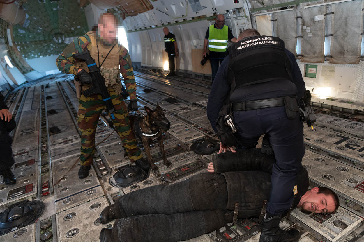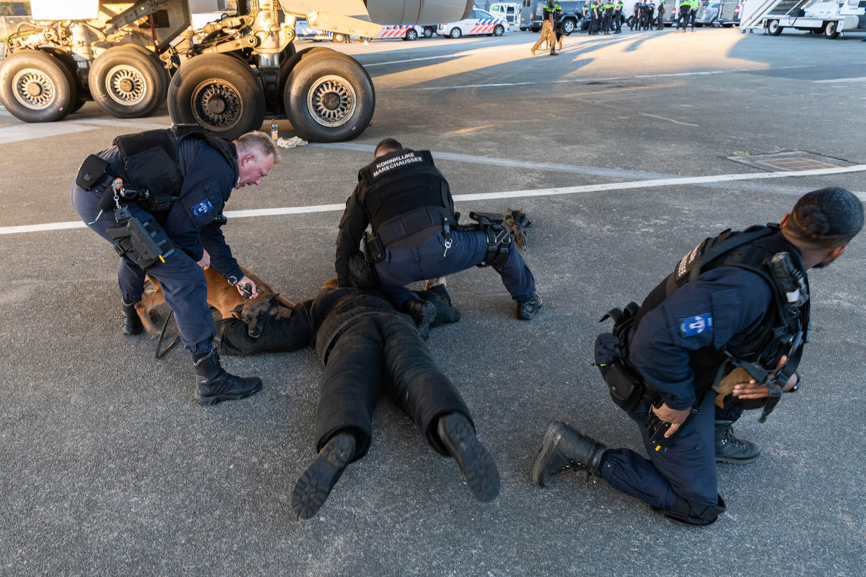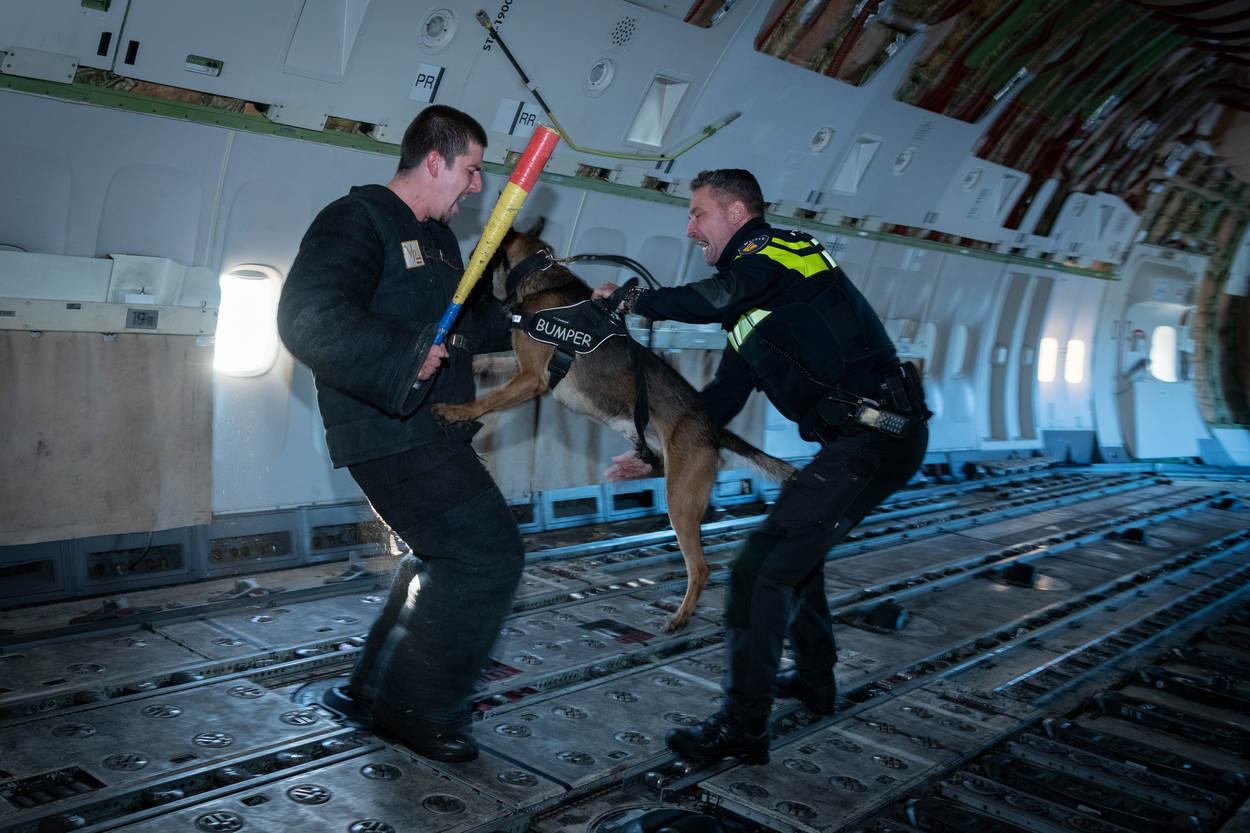 De opperwachtmeester opereert samen met 4 leden van de Hoog Risico Beveiliging (HRB) en oefent samen met hondengeleiders van de Nationale Politie, de Belgische Federale Politie en een lid van de Belgische antiterrorisme-eenheid de aanhoudingsprocedures. Ze leren van elkaars methode, waarin uiteraard ook overeenkomsten zitten. De diverse scenario’s spelen zich voornamelijk af in kleine vliegtuigruimtes en een bouwkeet op Schiphol-Oost. “Dergelijke oefenlocaties, zeker een echt vliegtuig, zijn zeldzaam”, weet oefenleider wachtmeester-1 Maikel Ponsen.