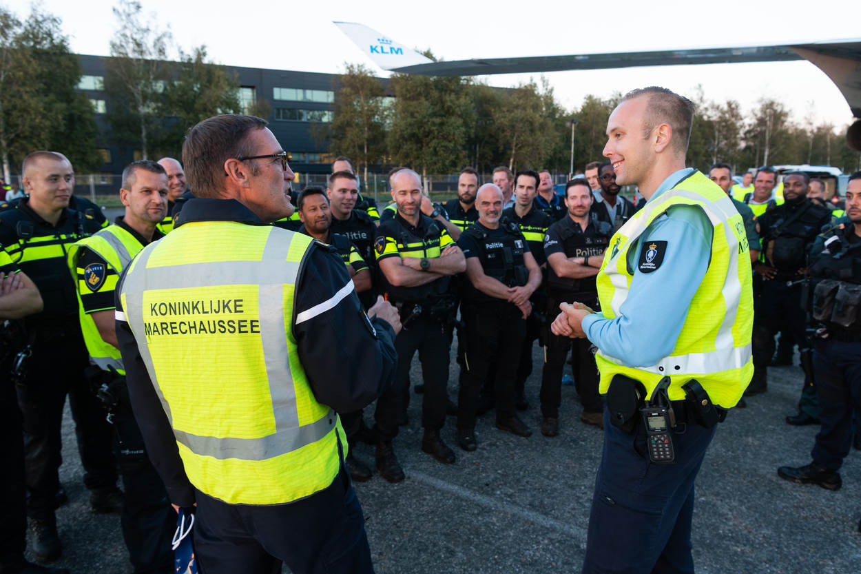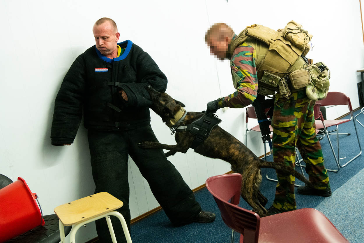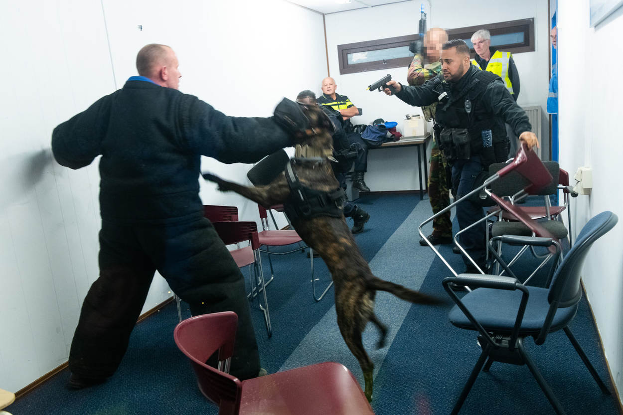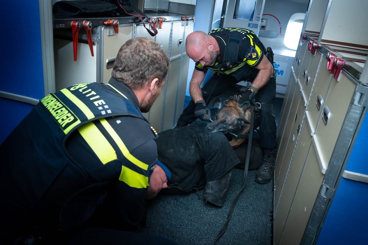 De opperwachtmeester opereert samen met 4 leden van de Hoog Risico Beveiliging (HRB) en oefent samen met hondengeleiders van de Nationale Politie, de Belgische Federale Politie en een lid van de Belgische antiterrorisme-eenheid de aanhoudingsprocedures. Ze leren van elkaars methode, waarin uiteraard ook overeenkomsten zitten. De diverse scenario’s spelen zich voornamelijk af in kleine vliegtuigruimtes en een bouwkeet op Schiphol-Oost. “Dergelijke oefenlocaties, zeker een echt vliegtuig, zijn zeldzaam”, weet oefenleider wachtmeester-1 Maikel Ponsen.