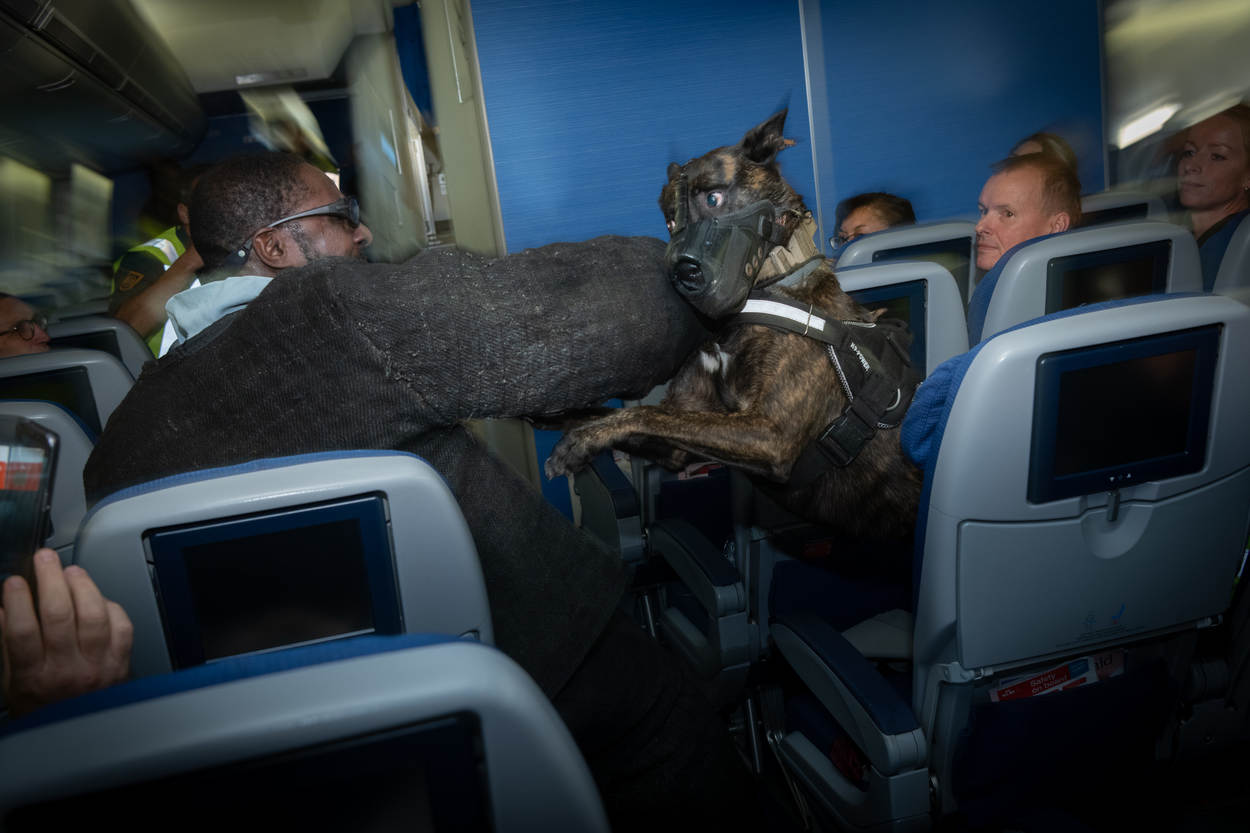Woeste geluiden uit het vliegtuigtoilet op Schiphol-Oost. Gehijg, gesjor en gegrom. “Laat me los! Alsjeblieft!”, schalt het angstig smekend door de cabine. Een grote sterke kerel wordt flink in zijn kladden gevat door een fanatieke hond. De figuranten luisteren verschrikt naar het drama, ook al is het maar een oefening.