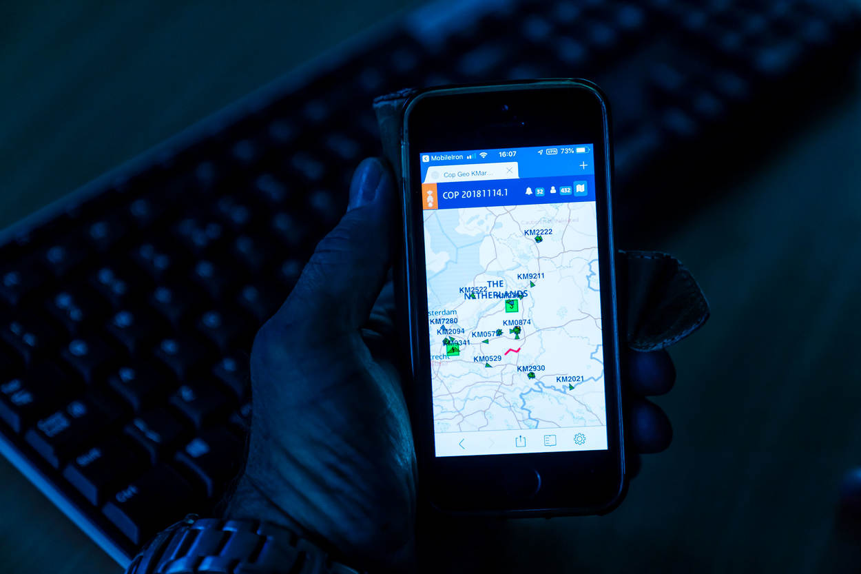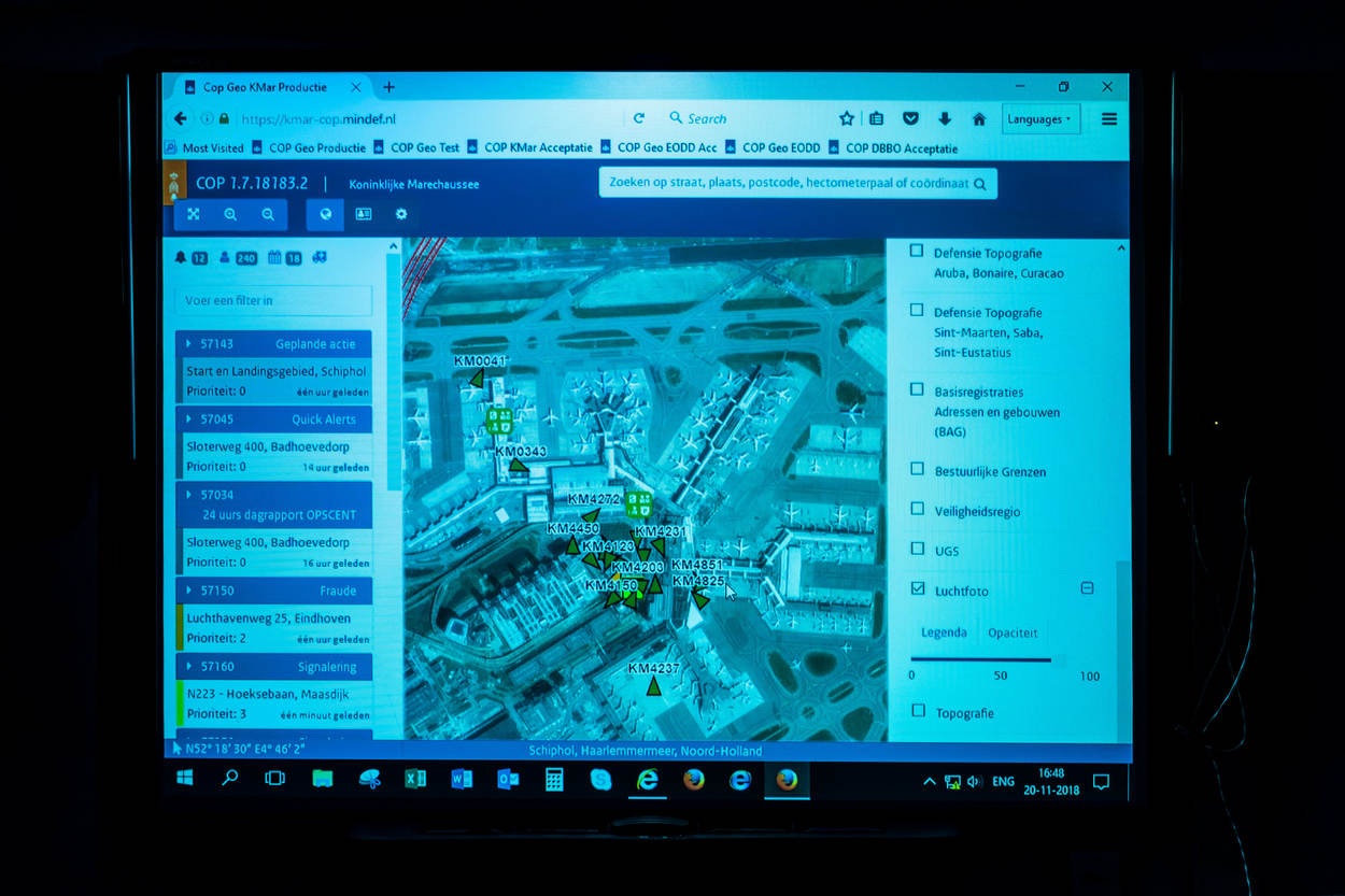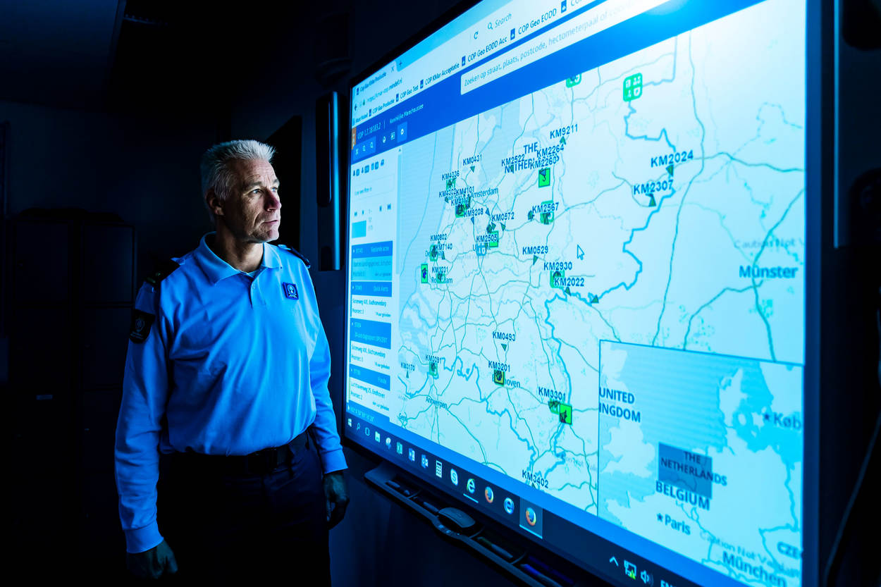 Hoe COPGEO werkt? Eenheden melden zich bij aanvang dienst via de portofoon of mobilofoon aan, waarna ze op de digitale kaart met roepnummer zichtbaar worden. Zodra ze zich verplaatsen, volgt elke 30 seconden een positiemelding. Worden surveillerende eenheden gekoppeld aan een incident, dan verschijnt door toedoen van de OPS-Room een passend icoontje in beeld. Hier beschikt men over een aangepaste versie, die bij iedere vastgelegde melding meteen de omgeving van het incident presenteert. Van Ee: “Op termijn zijn ook aanrijtijden en de weer- en verkeersituatie te raadplegen. In de basisopleiding van de KMar wordt op termijn ingegaan op hoe COPGEO in de praktijk werkt.”