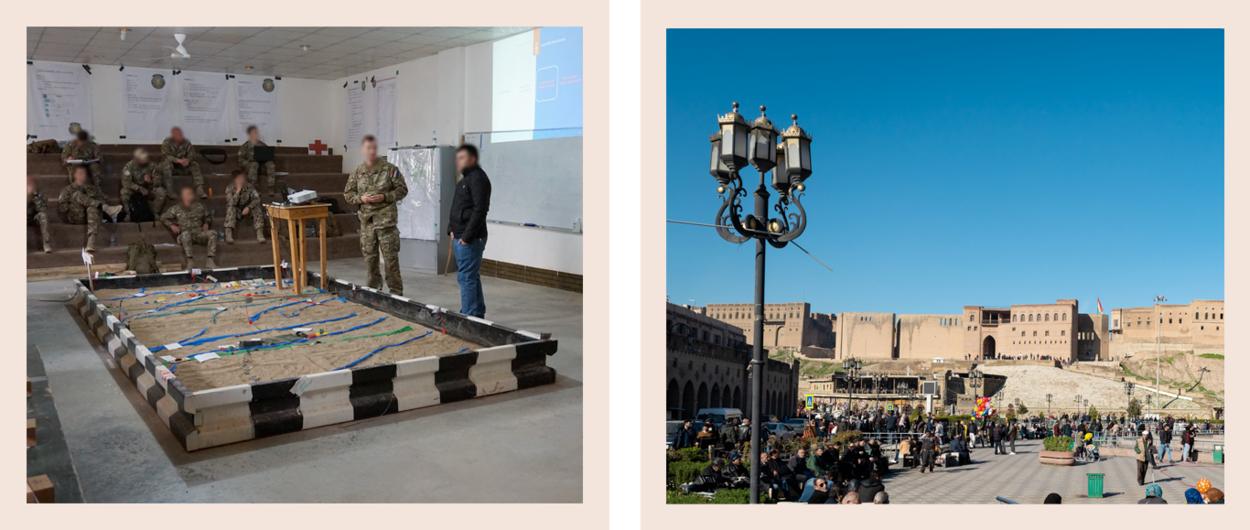 Links: We hebben onder meer les gegeven in Law of Armed Conflict, ofwel: humanitair oorlogsrecht. Rechts: Uitzicht op de citadel van Erbil.