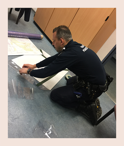 Het oefenterrein is erg groot, we gebruiken stafkaarten om te navigeren.