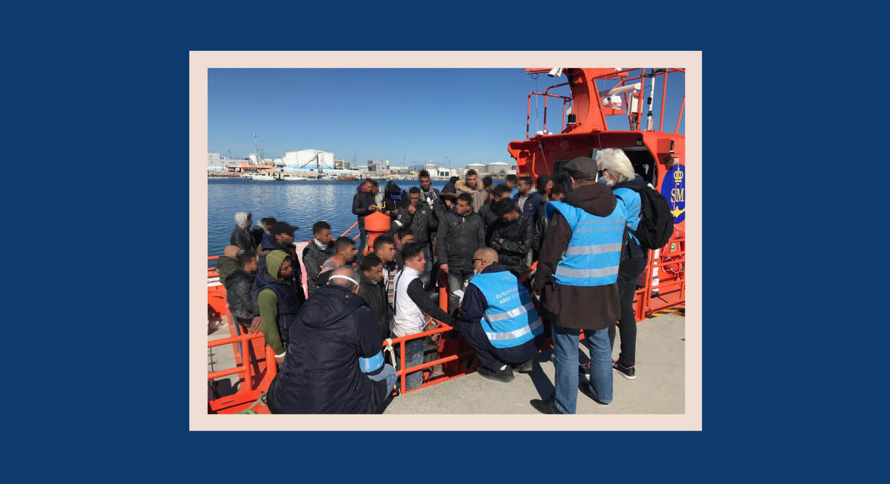 Een SAR-boot vol migranten die van zee zijn gehaald. Ervoor staan Frontex-teamleden. Wij werken in burger.