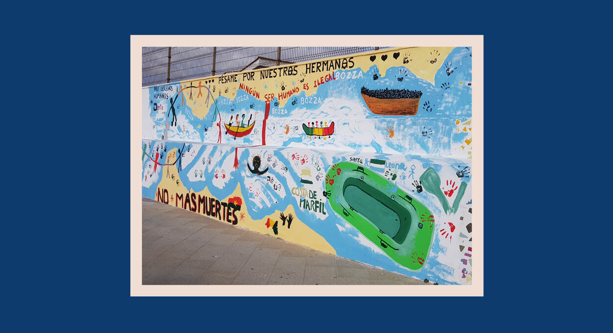 Muurschildering over het gevoelige onderwerp van migratie.