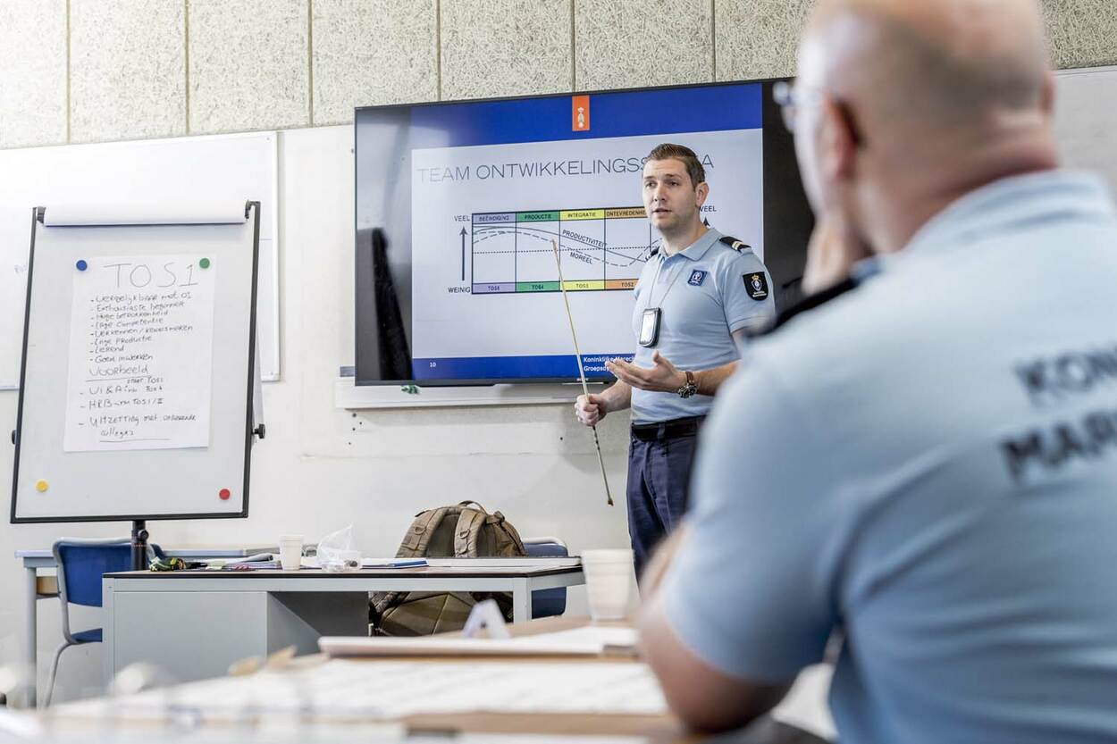 De les groepsdynamica van de Leergang Senior Medewerker (LSM)-opleiding doet zijn naam eer aan en is met recht ‘dynamisch’ te noemen. Hier worden de groepscommandanten in spé voorbereid op een leidinggevende functie. Zaken als feedback en teamontwikkeling worden besproken. Een van de wachtmeesters wint er tijdens de les geen doekjes om: “Soms ben je nu eenmaal degene die zowel van boven als van beneden de kritiek krijgt.” De opmerking leidt tot een interessante discussie. “Ik vind dat soms lastig”, reageert een medestudent. “Dan zit je er letterlijk tussenin. Voor mij voelt dat niet goed.”