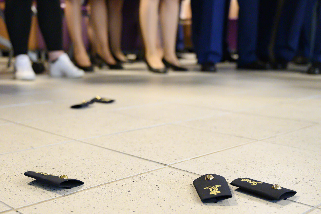 Stralende ogen, een brede glimlach. De gemoedstoestand van Frank Bal, laat zich niet lastig raden deze middag in Apeldoorn. “Ja, dit maakt me écht happy”, zegt de initiatiefnemer van de logistieke opleiding voor KMar'ers. Met gepaste trots schuift de kolonel de luitenantssterren op de schouders van ‘zijn jongens’.
