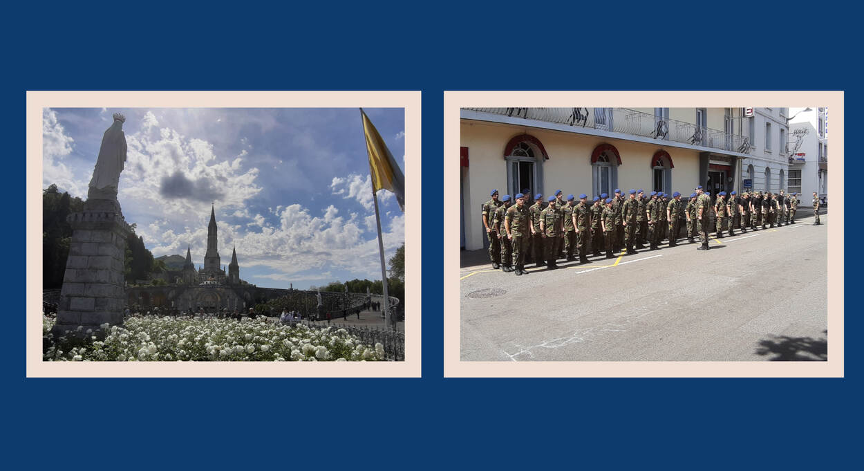 Links: Lourdes, de grootste katholieke bedevaartplaats in Frankrijk. || Rechts: OTCKMar-leerlingen in afwachting van de mars naar het heiligdom.