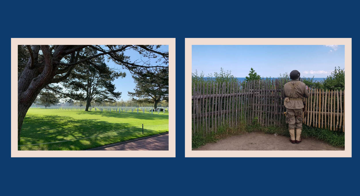 Links: De Amerikaanse begraafplaats. Een van de begraafplaatsen waar de vele gesneuvelde militairen begraven liggen. || Rechts: Door heel Normandië reden oude legervoertuigen en droegen mensen oude legeruniformen, zoals hier bij de voormalige Duitse batterijen.
