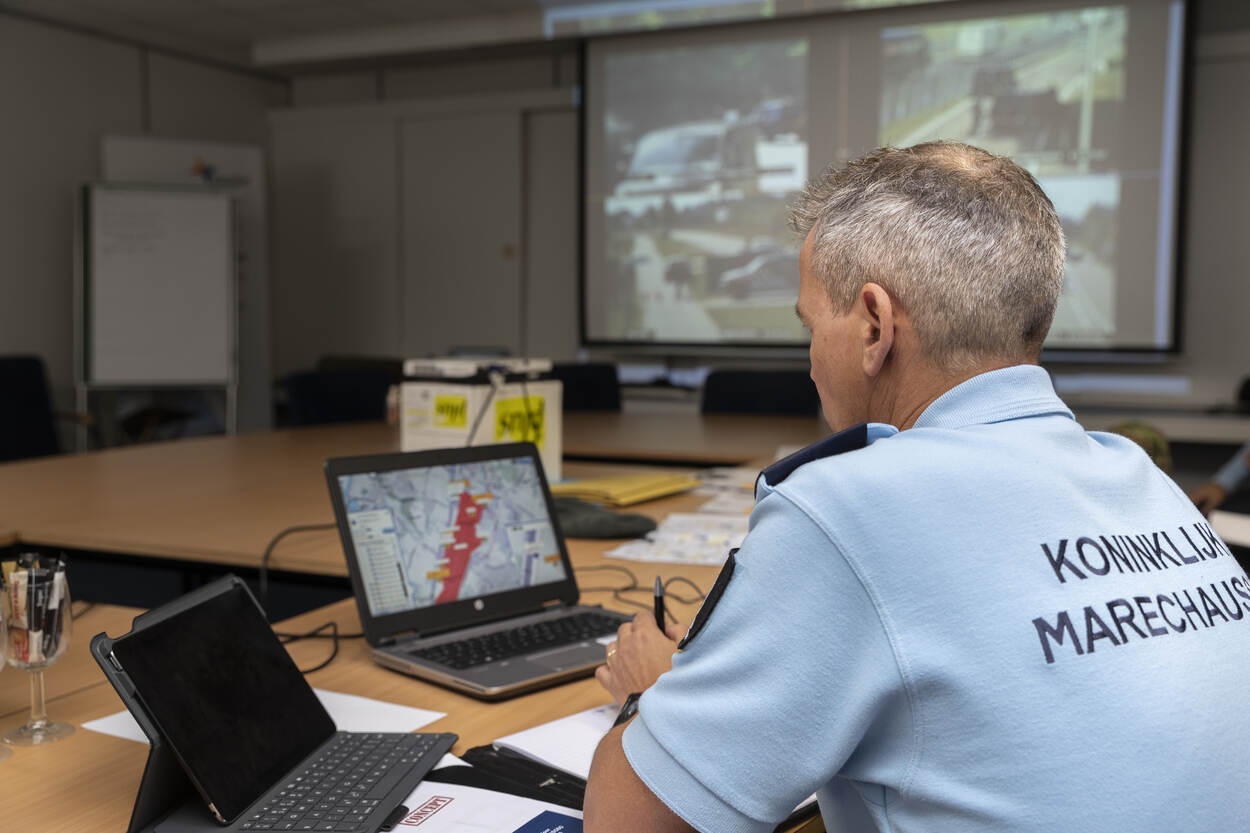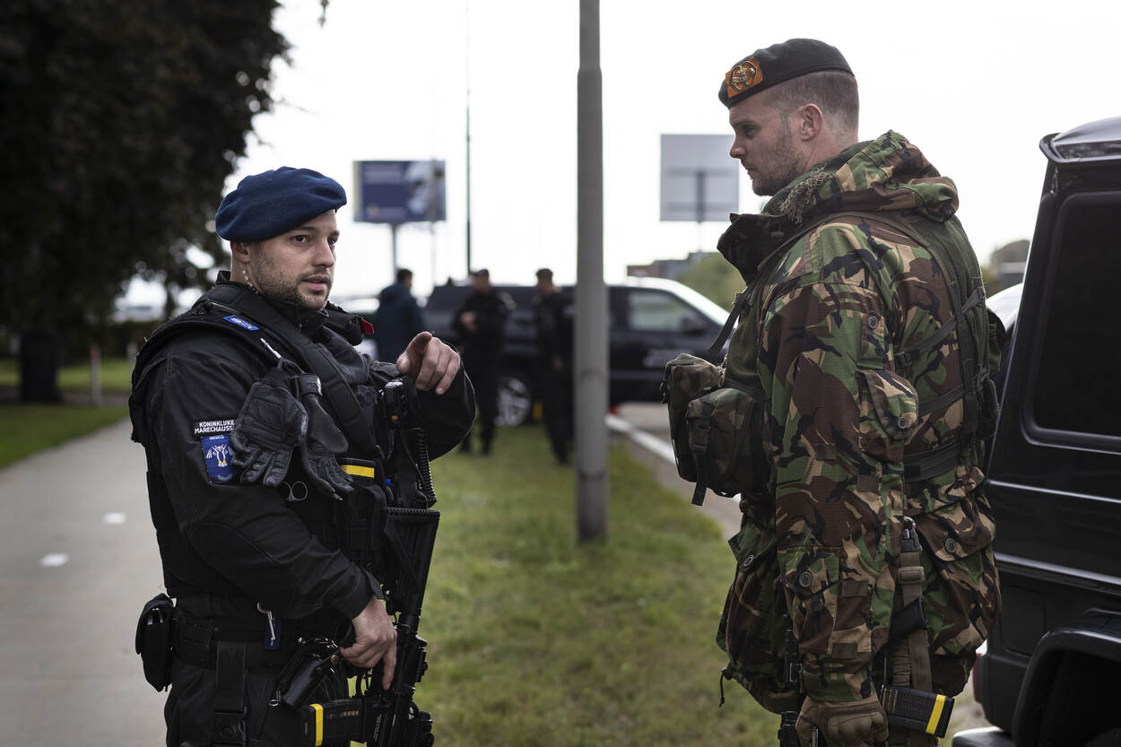 1. Aanleiding voor het verhogen van het dreigingsniveau is een bericht op social media. Daarin kondigt een terroristische organisatie aan een aanslag te willen plegen op Maastricht Aachen Airport. Omdat de KMar verantwoordelijk is voor de beveiliging van de burgerluchtvaart maakt 1 peloton van de Hoog Risico Beveiliging (HRB) zich klaar voor inzet. 2. Pelotonscommandant HRB tweede luitenant Dennis: “Ik heb wel vaker oefeningen gedraaid, maar die waren meestal alleen op papier. Een praktijkoefening als deze zouden we veel vaker moeten doen. Dan weet je waar je als eenheid aan toe bent en waar je tegenaan loopt. Nu kunnen we echt laten zien dat we er staan als het erop aankomt. Ik hoor alleen maar positieve geluiden uit mijn peloton.” 3. De HRB vertrekt onder begeleiding van de motorpool richting Maastricht Aachen Airport. Daar nemen ze de bewaking en beveiliging van de luchthaven over van de collega’s van de brigade Limburg-Zuid. Ook wordt de Delta-compagnie van 17 Pansterinfanteriebataljon van 13 Lichte Brigade gealarmeerd om bijstand te verlenen aan de KMar en zo het voortzettingsvermogen van de inzet te waarborgen. 4. Eenmaal bij de luchthaven bouwt de HRB een aantal roadblocks. Behalve statische inzet wordt er ook dynamisch gepatrouilleerd. “Deze inzet sluit naadloos aan op onze normale werkzaamheden. Of je nu een object in de Randstad beveiligt of een luchthaven, onze opdracht is hetzelfde. We zorgen dat het vliegverkeer door kan gaan en treden op als dat nodig is”, vertelt marechaussee-1 Arie. 5. In de ‘blauwe kamer’ volgt de oefenleiding alles op de voet. De scenario's bij de roadblocks worden met camerabeelden gevolgd. Majoor Ronald Sanders: “We gebruiken het Landelijk Crisis Management Systeem. Onze ketenpartners doen dat ook. Ideaal, want daarin staat wie wat doet en heeft gedaan. De situatie wordt live bijgehouden. Goed voor de situational awareness.” 6. Groepscommandant wachtmeester-1 Jelle bemant met zijn collega’s 1 van de roadblocks. Alle voertuigen die op de luchthaven moeten zijn, worden met argusogen bekeken. “Behalve de scenario’s met acteurs passeren hier ook mensen die niks met de oefening te maken hebben. Als we met een echte situatie worden geconfronteerd, kunnen we een beroep doen op de collega’s van de brigade Limburg-Zuid.” 7. De hulptroepen van 13 Lichte Brigade uit Oirschot zijn gearriveerd. De KMar stuurt de ‘groene’ collega’s aan. Landmachters zijn immers geen opsporingsambtenaar, maar ondersteunen de HRB waar mogelijk. Met de extra handjes is het eenvoudiger om te rouleren met de capaciteit en is het voortzettingsvermogen van de inzet gegarandeerd. 8. Groepscommandant sergeant-1 Chris van 17 Pansterinfanteriebataljon over de samenwerking: “In het begin moesten we het radioverkeer wel even afstemmen, maar we praten in grote lijnen dezelfde taal. De verschillen? Wij komen niet vaak met de burgerbevolking in aanraking, de KMar wel. Wij hebben daarentegen weer meer ervaring met roadblocks. Nu staan we schouder aan schouder, met hetzelfde doel.” 9. Soldaat-1 Ramon: “Ik vind deze inzet erg leuk om te doen. Het is weer eens wat anders. Normaal werken we in het bos. Ik beman samen met een KMar-collega een roadblock. Hij doorzoekt een voertuig en ik hou de omgeving en personen in de gaten. Ik ben erg benieuwd hoe het allemaal verder gaat. Het is in ieder geval leuk om te zien dat de KMar dingen anders doet, maar dat hun aanpak ook werkt.” 10. Een oefening is geen oefening als er niet ook daadwerkelijk iets gebeurt. Alle roadblocks werden ‘getrakteerd’ op een aantal casussen. Mensen die afwijkend gedrag vertoonden, een journalist, een vlogger, scheldende burgers en 2 mannen die een verkenning uitvoerden. Aan de bewakers en beveiligers de taak om de verdachte situaties te onderkennen en actie te ondernemen.