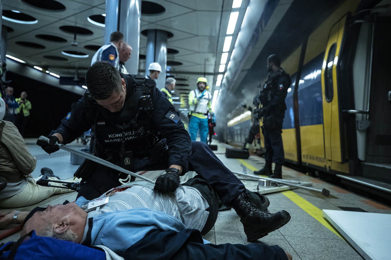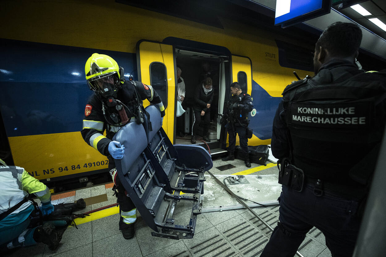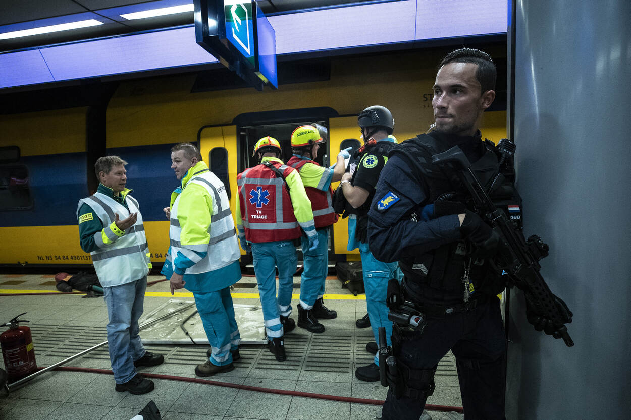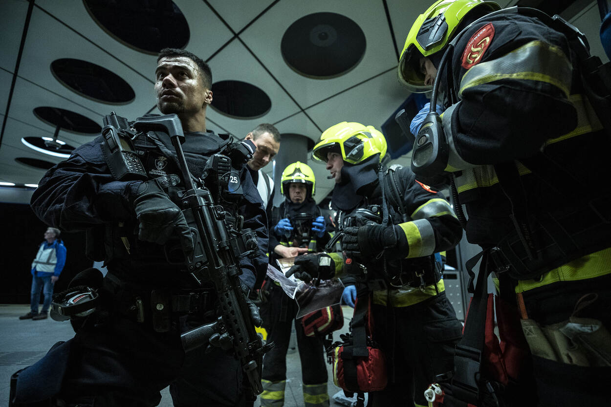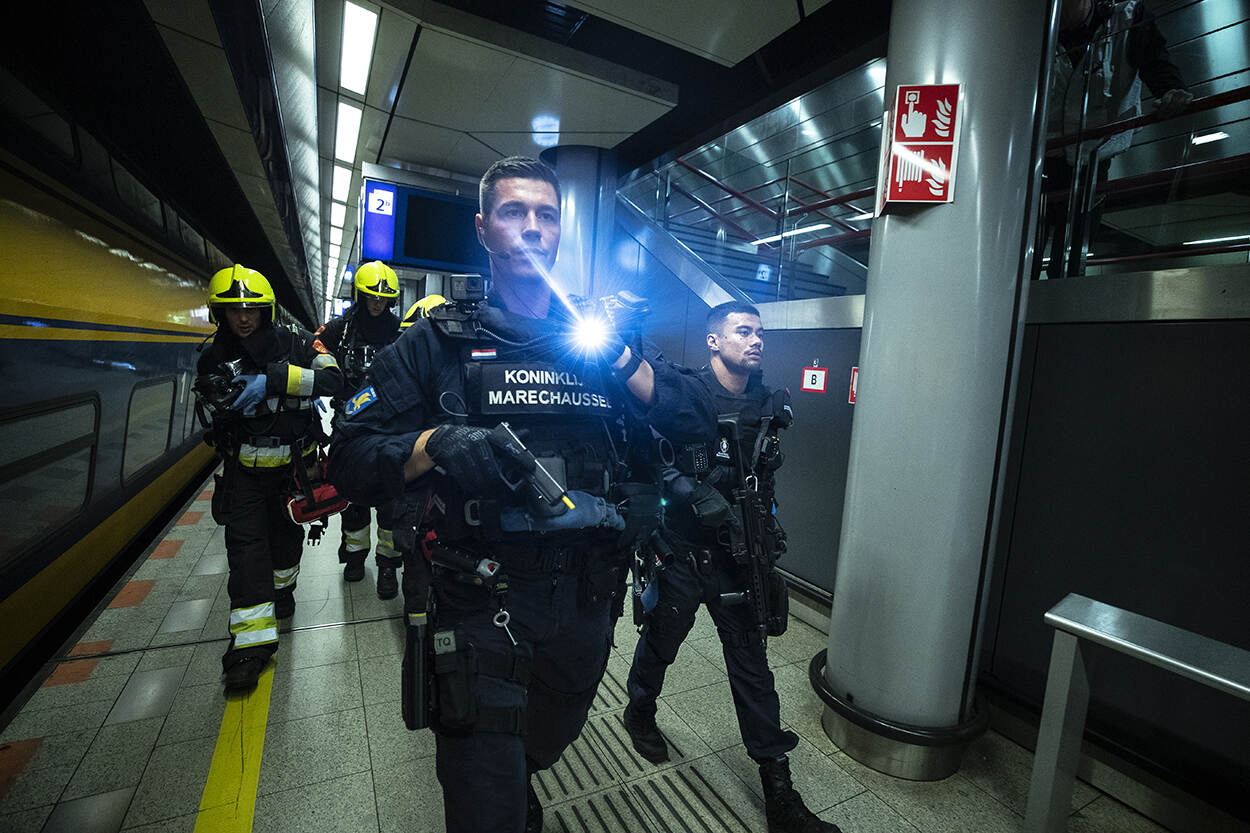 Ook brandweer, Gemeentelijke gezondheidsdienst (GGD) en andere hulpdiensten zijn snel ter plaatse. Boven in de hal overleggen de officieren van dienst van iedere eenheid over de situatie en de te nemen stappen. In de treintunnel controleert de GBB de trein en omgeving.