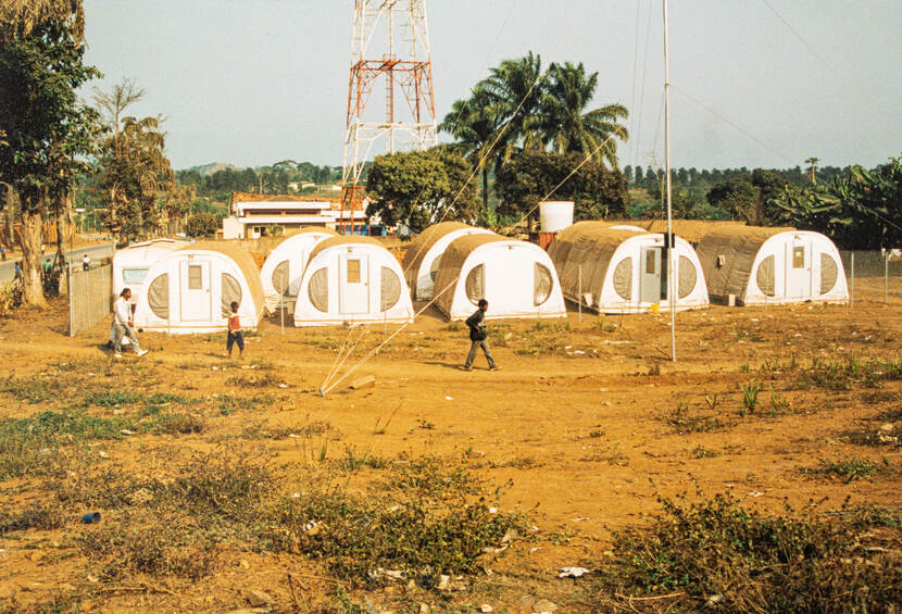 Het kamp in het dorpje Uige. Back to basic. Op de achtergrond de mast voor de verbindingen.