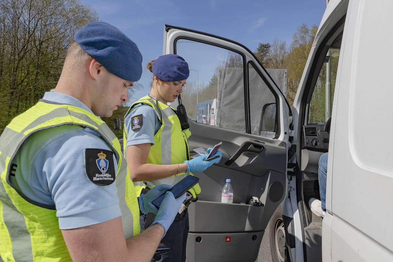 Collega’s tijdens een MTV-controle vorige maand bij grensovergang De Lutte bij Oldenzaal. Foto: sergeant Cristian Schrik.