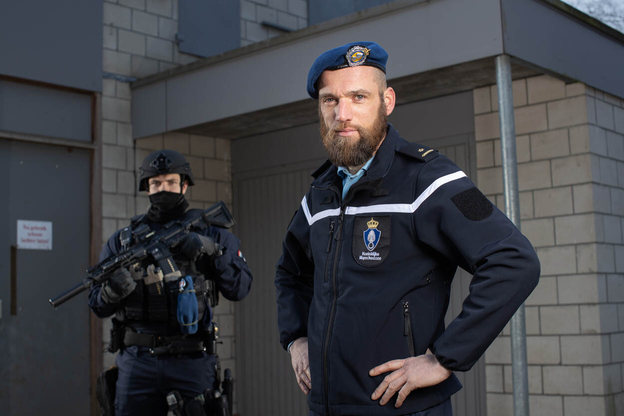 GBB-operator marechaussee-1 Tristan droeg samen met een collega van de HRB de afgelopen maanden het vest en de belt. Ze beproefden de artikelen, toonden ze aan hun collega's, gaven feedback aan de projectgroep en bespraken verbeterpunten. Het resulteerde in een prototype dat de KMar onlangs van DMO overhandigd kreeg. Tristan is enthousiast over het resultaat: "Ik sport veel, maar als ik 4 of 5 diensten achter elkaar draaide, begon ik het gewicht van het vest ook echt wel te voelen. Nu kun je het vest met afsteuningspaneel aan de achterzijde van de belt vastmaken. Door ze met elkaar te verbinden, lijkt het alsof het vest - inclusief de ballistische bescherming - deels wordt opgetild. Daardoor neemt de fysieke belasting voor mij en mijn collega's af."