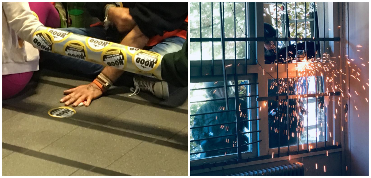 Een van de demonstranten had zijn handen vastgelijmd aan een buis boven de ingang.