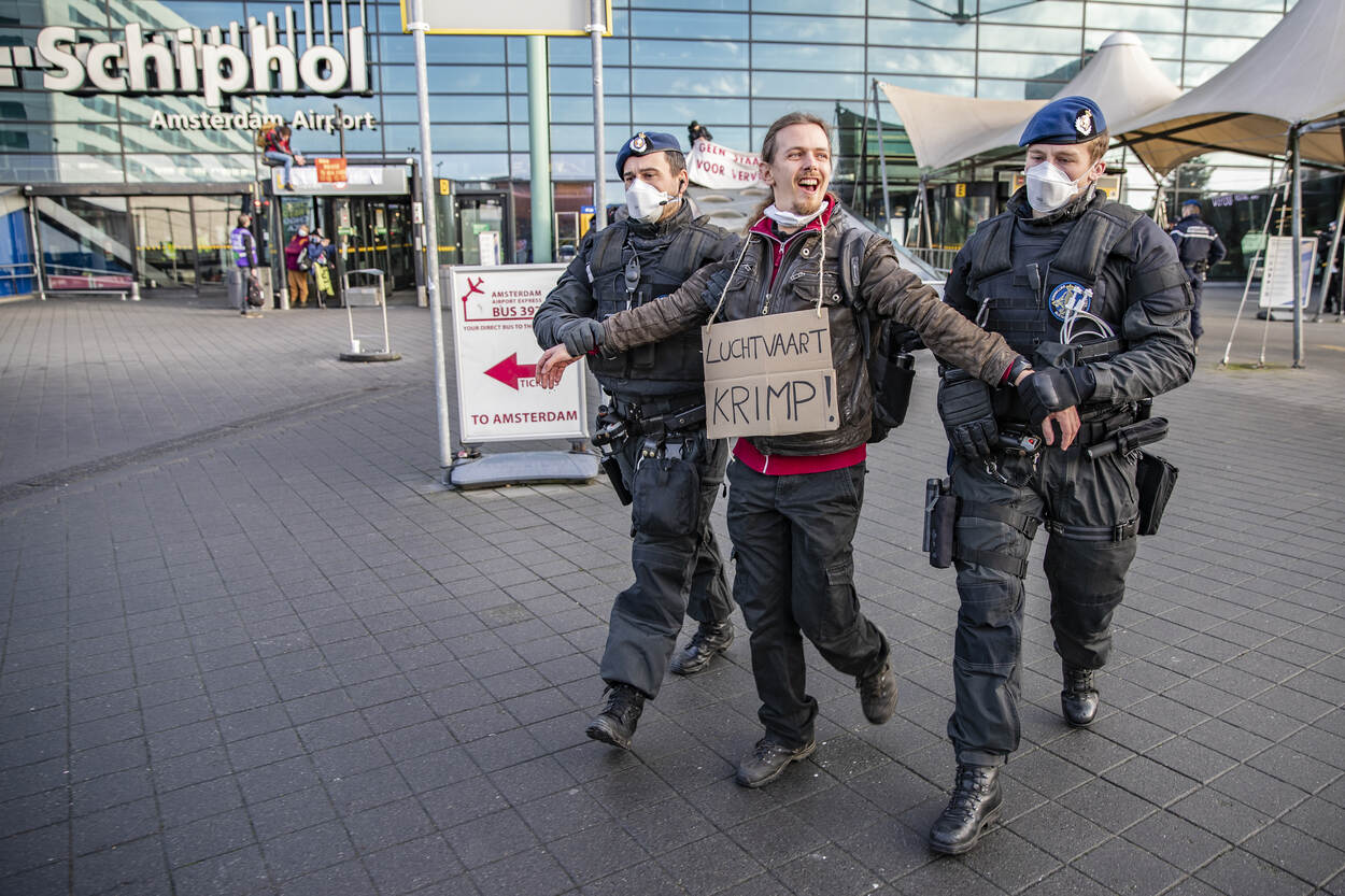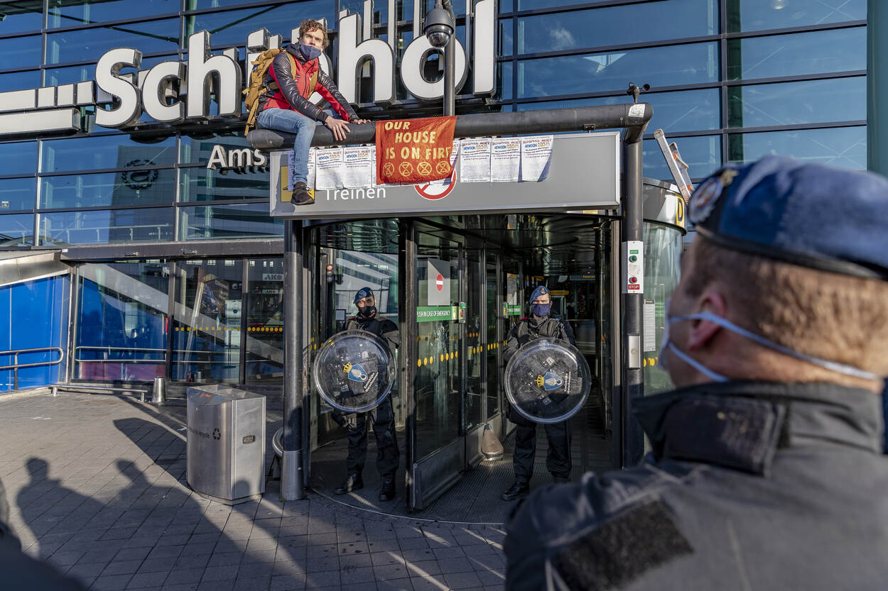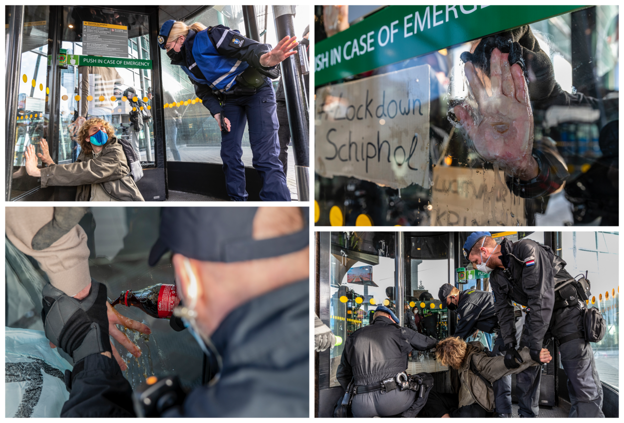 Remy: “Als ze zich allemaal gedragen, hoeven we niet in te grijpen. Maar sommigen hadden zich al vrij snel vastgeplakt aan enkele centrale draaideuren van Schiphol en blokkeerden dus deels de ingang. Ze zaten met hun handen vastgelijmd aan het glas.”