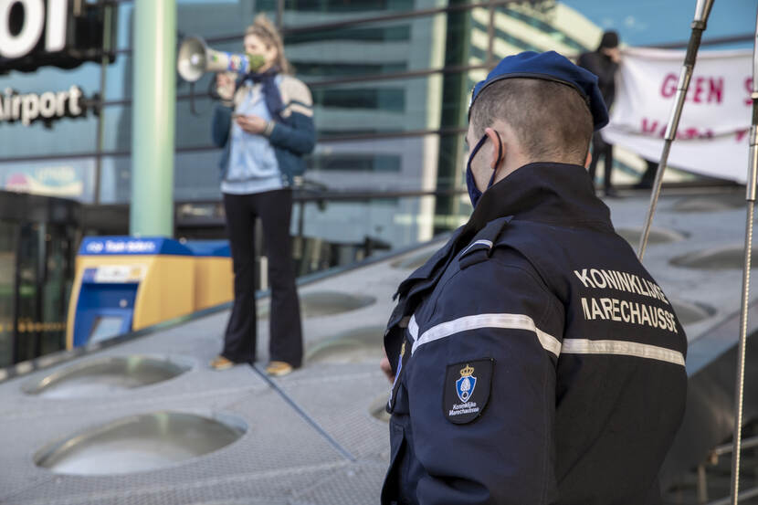 Saskia: “Vanaf een podium spraken enkele aanvoerders de groep toe met een megafoon. Er waren zo’n 80 betogers. Door corona was het rustig op Schiphol, dat maakte een groot verschil met vorig jaar.”