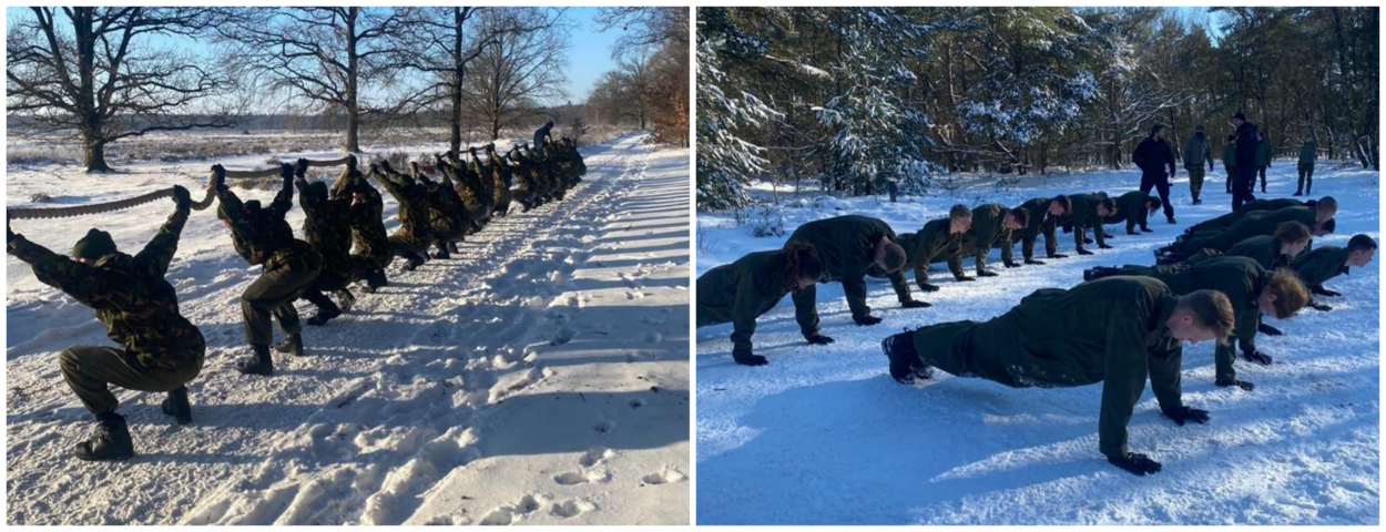 Tijdens de sneeuwbivak is het natuurlijk ook belangrijk om de bloedsomloop op gang te houden. Een dankbare taak voor de sportinstructeurs van de Integrale Beroepsvaardigheden Training (IBT). Ze hebben een aangepaste les gegeven om de nieuwe lichting te wapenen tegen de kou. Het hardlopen werd vanwege de gladde ondergrond vervangen door oefeningen met het bovenlichaam.