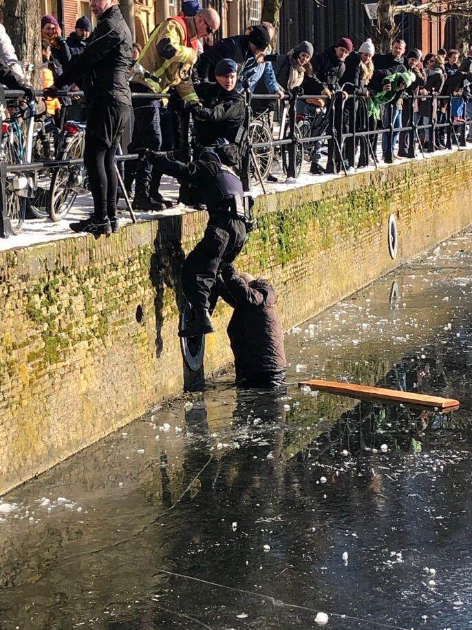 Marechaussees boden een helpende hand toen gestrande schaatsers weer op de wal moesten worden gehesen. De schaatsers waren vast komen te zitten op een eilandje in de Haagse Hofvijver, toen het ijs eromheen te zwak werd. (Foto: Twitter Laurens Boven)