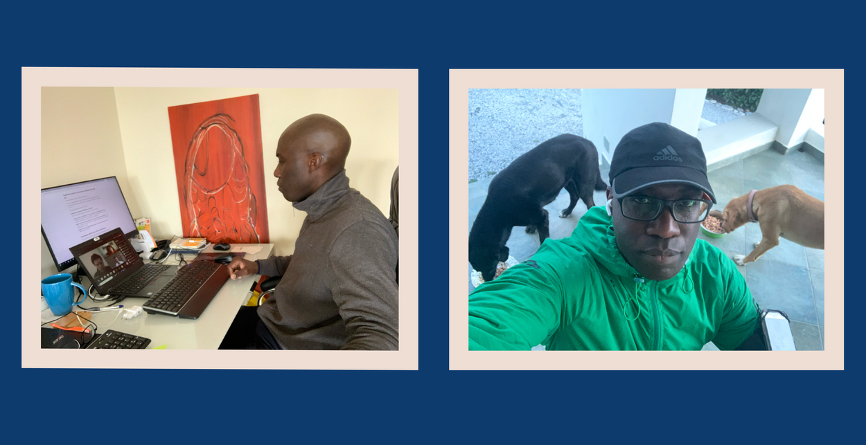 Links: Veel telewerken vanuit mijn ‘kantoor’ wanneer ik niet op het kamp ben. Rechts: Samen met mijn vaste loopmaatjes.