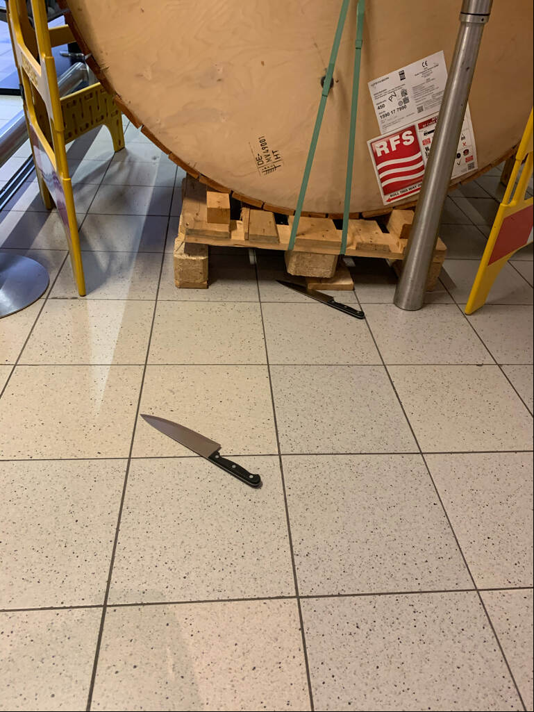 “Binnen een minuut waren we ter plaatse. Toen we onze auto hadden weggezet en door de draaideuren naar binnen gingen, zagen we een andere collega al voorbij rennen, opperwachtmeester Hans. Wij renden nog maar net achter hem aan, toen hij zijn vuurwapen al ter hand nam en op iemand richtte. Wij stonden meteen oog in oog met een man die agressief stond te zwaaien met 2 grote koksmessen. Ik greep ook mijn vuurwapen en richtte op hem.
