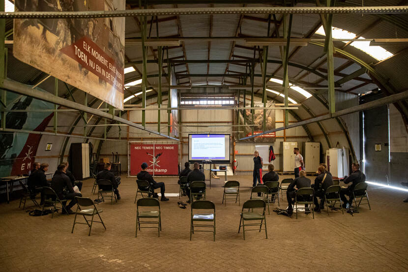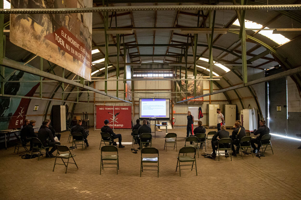 Mentale vorming, houding en gedrag: ze staan centraal tijdens het gloednieuwe Kamp V. Iedereen die bij Gewapende Beveiliging Burgerluchtvaart (GBB) of de Hoog Risico Beveiliging (HRB) aan de slag gaat, brengt voor de functieopleiding een week door op het tentenkamp op de Oranjekazerne in Schaarsbergen. “Door soft skills te trainen, word je beter in je optreden.”