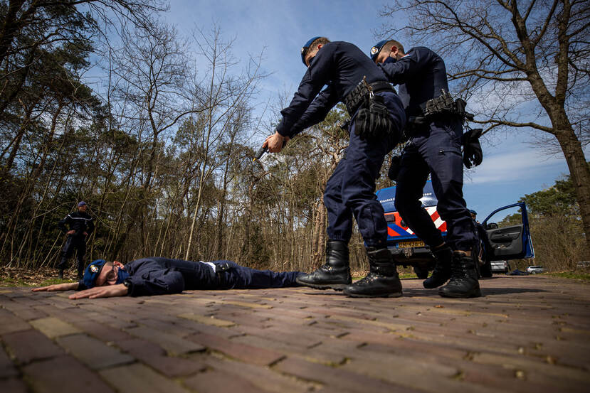 “Dit is de Koninklijke Marechaussee. Wij hebben een vuurwapen op u gericht”, klinkt het uit de megafoon. Achter de Amarok staan 2 gewapende marechaussees, gereed om in te grijpen. Voor hen: een scheef geparkeerd busje met daarin 2 vuurwapengevaarlijke verdachten.