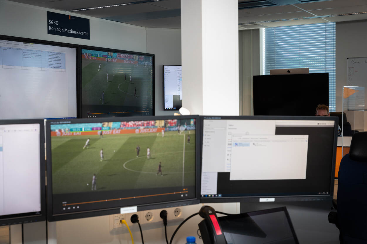 Ook wanneer de supporters het luchthaventerrein verlaten houden Van Ee en zijn SGBO-collega’s nog een oogje in het zeil. Maandenlang is er intensief overlegd met externe partners zoals het NCTV, de gemeentes Haarlemmermeer en Amsterdam en uiteraard de politie. Van Ee: “De lijnen zijn kort. Signaleert iemand iets of dreigt de situatie ergens uit de hand te lopen dan komt dat ook bij ons terecht.” Het zwaartepunt van de SGBO ligt desalniettemin op de momenten voor en na de wedstrijd. En tussendoor? Dan mag er van de commandant best even verantwoord ontspannen worden. “Dat grote scherm bij ons gaat echt wel aan!”