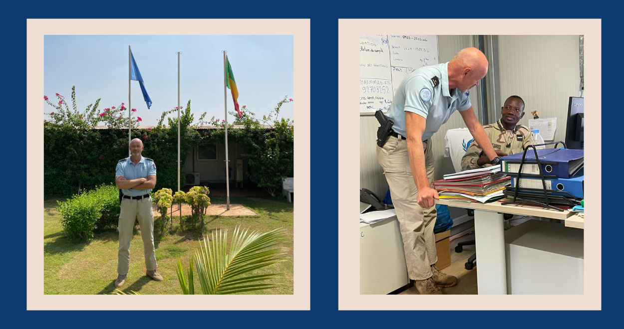 Links: Op het VN-hoofdkwartier in Bamako. | Rechts: Samenwerking met een gendarme uit Burkina Faso.