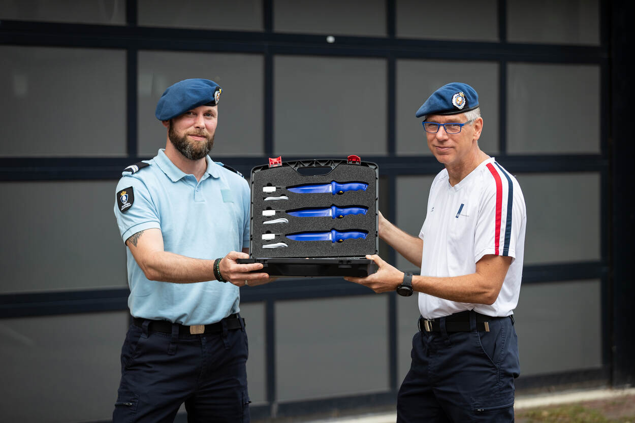 Behalve een tevreden behoeftesteller in de persoon van Van Vliet, zijn ook de verwervers van de sector Ondersteuning van het OTCKMar in hun nopjes. De eerste 10 van de in totaal 20 E-Knifes zijn inmiddels overgedragen. Plaatsvervangend hoofd van de sector kapitein Rolf: “We zijn als sector steeds verder aan het professionaliseren om zo onze gebruikers steeds makkelijker en sneller te bedienen. Dit is een mooi resultaat dat we hebben geboekt. Op de achtergrond hadden we het nodige te regelen voor we het E-Knife konden verwerven. Zo moest de Stafarts KMar beoordelen of het mes wel veilig genoeg was en moest er een besluit worden genomen over waar en hoe het E-Knife opgeslagen moet worden.”