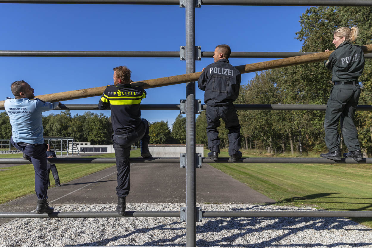 Teambuilding op de hindernisbaan. IBT-instructeur wachtmeester-1 Husnu doet voor hoe je de evenwichtsbalk neemt. Voor sommigen is het lang geleden, voor anderen zelfs de allereerste keer.
