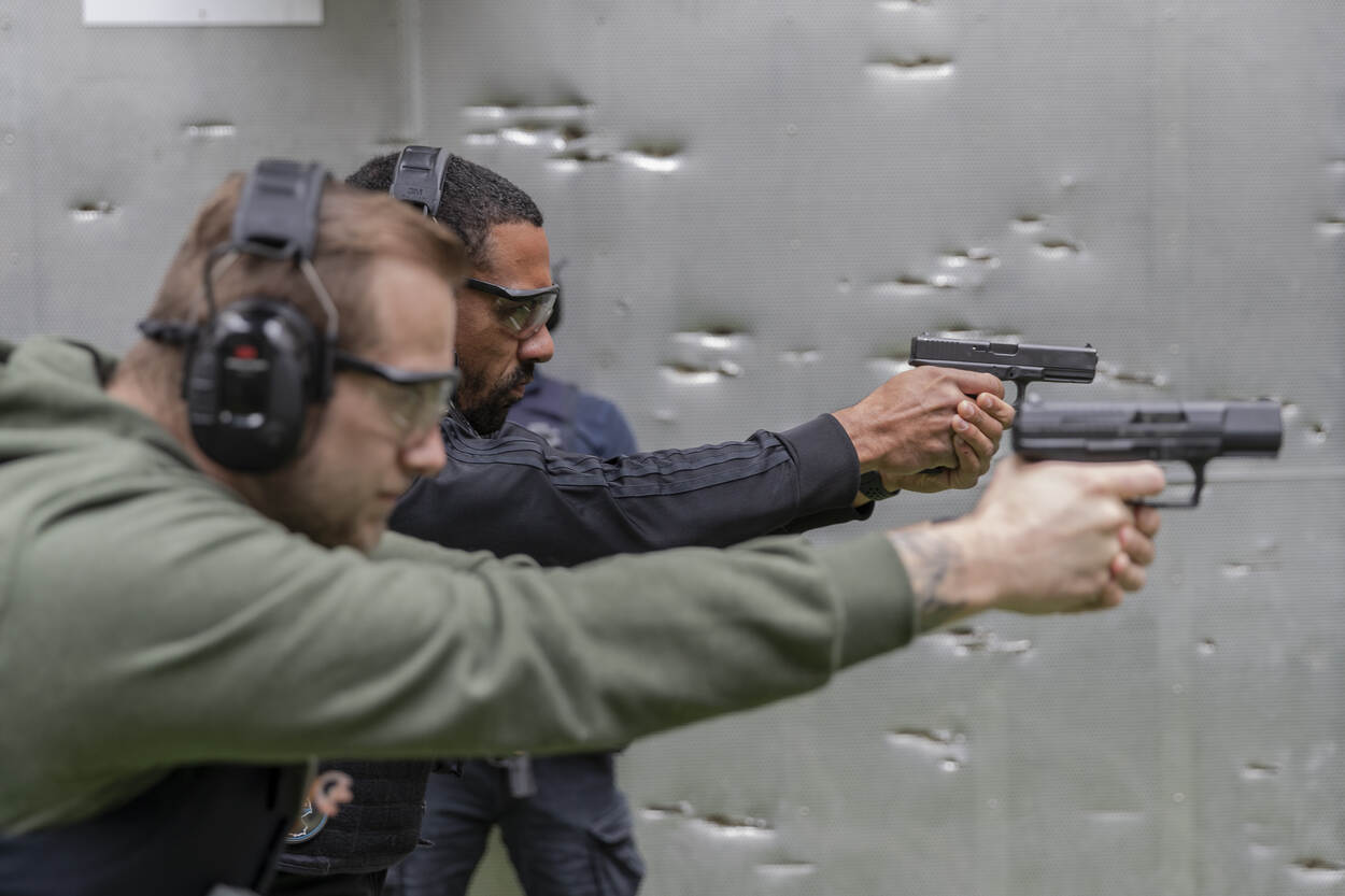Schieten met elkaars wapen. Wachtmeester Bradley schiet met een Heckler & Koch-pistool van de Duitsers, en zijn Duitse collega Simon oefent met de Glock.