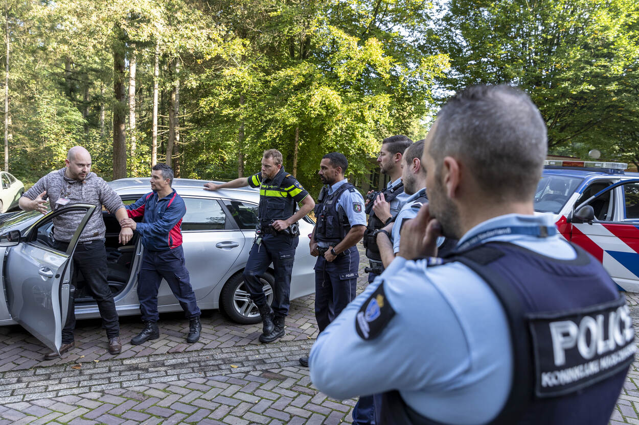 Gezamenlijk optreden in de praktijk: Bram (KMar) en Yunus (Bundespolizei) oefenen hier als koppel de procedure waarbij je een vuurwapengevaarlijke verdachte uit het voertuig praat.