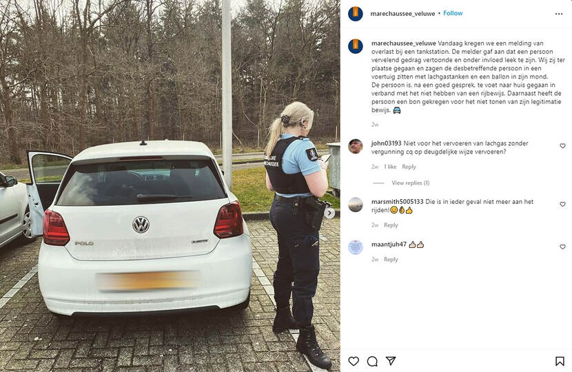 Brigade Veluwe: "We kregen een melding van overlast bij een tankstation. De melder gaf aan dat een persoon vervelend gedrag vertoonde en onder invloed leek te zijn. Wij zij ter plaatse gegaan en zagen de desbetreffende persoon in een voertuig zitten met lachgastanken en een ballon in zijn mond. De persoon is, na een goed gesprek, te voet naar huis gegaan in verband met het niet hebben van een rijbewijs. Daarnaast heeft de persoon een bon gekregen voor het niet tonen van zijn legitimatiebewijs."