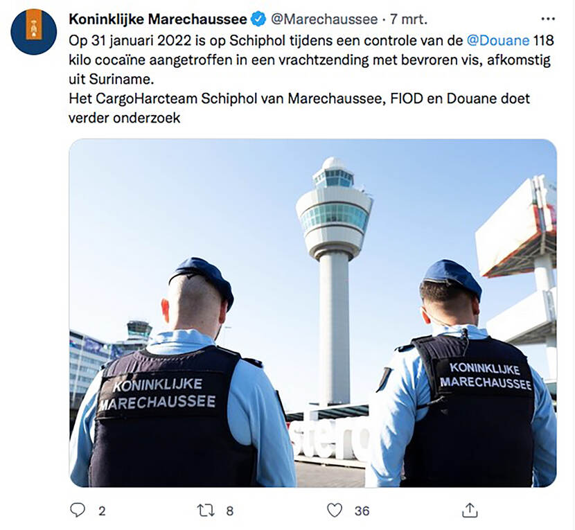 In een lading met bevroren vis bleek 118 kilo cocaïne verstopt te zijn. Het ging om een vrachtzending die afkomstig was uit Suriname. Een gecombineerd team van de Marechaussee, FIOD en Douane probeert te achterhalen wie er achter de drugssmokkel zit.