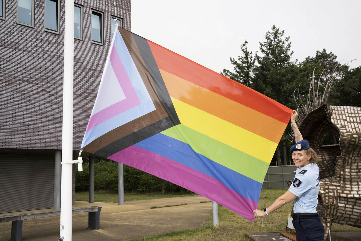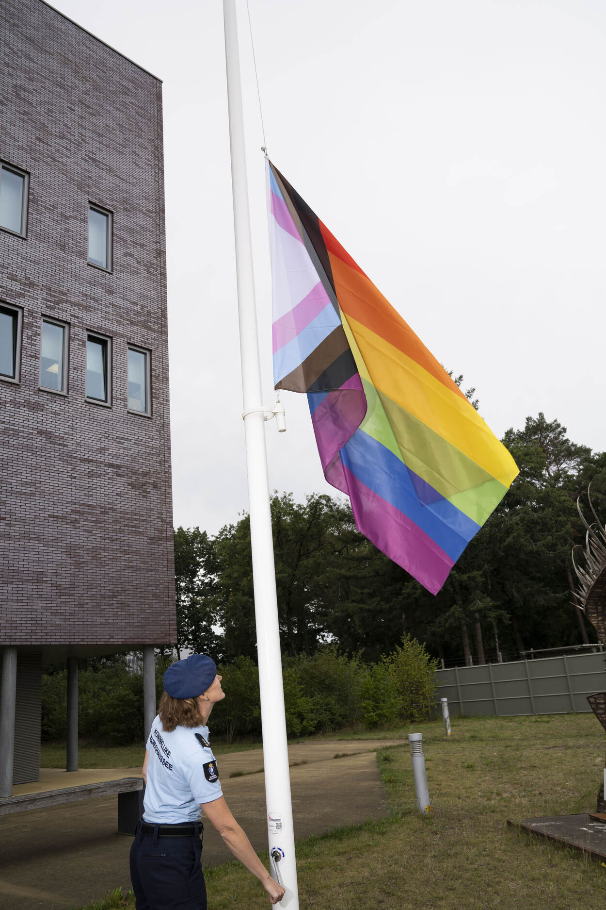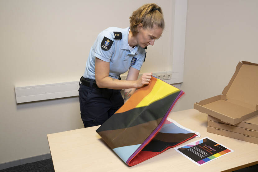 Adviseur Diversiteit en Inclusie kapitein Annelies Koning is al bezig met de voorbereidingen voor 11 oktober: het verzamelen, inpakken en versturen van de 25 kleurrijke vlaggen. In de postpakketten met de nieuwe vlag zit ook een flyer met uitleg over het hoe en waarom van de nieuwe kleuren. “Met deze vlag willen wij als organisatie uitdragen dat iedereen bij ons welkom is en dat iedereen het hele jaar door zichzelf mag zijn.” Ook wil de organisatie hiermee de lhbti+-collega’s een hart onder de riem steken. “Het is belangrijk dat ze weten dat ze worden gesteund.”