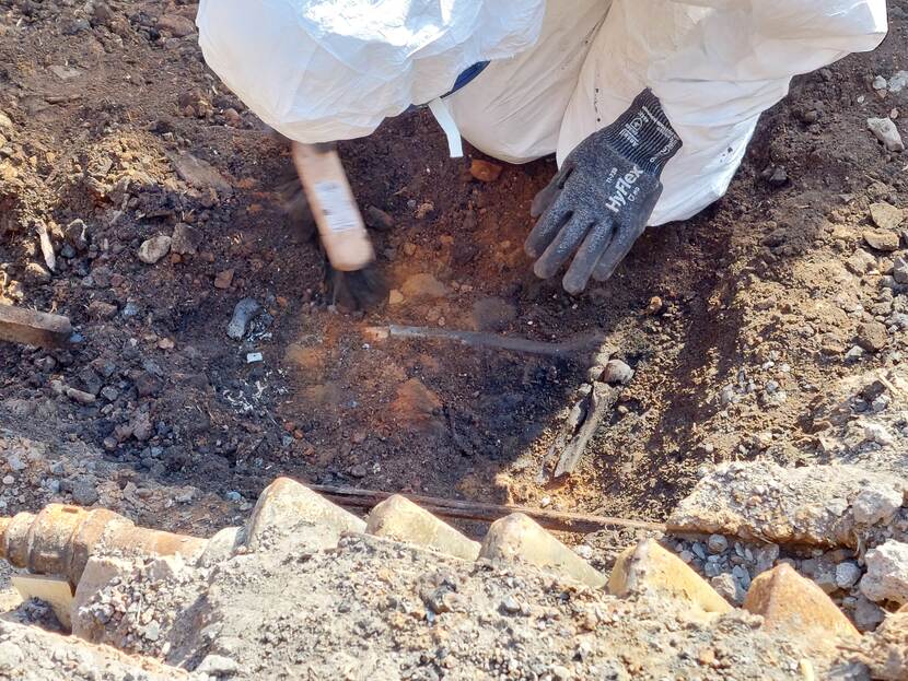 Een Nederlandse forensisch arts legt lichaamsdelen bloot in het puin van een vernietigd woonhuis.